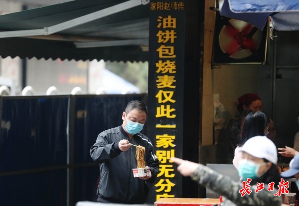 “真香!皮脆肉糯。”咬下一口油饼包烧麦,西安游客刘女士一脸满足,连连说好吃。她告诉记者,自己是这家店的回头客。今年1月,她第一次来武汉,就慕名来到“赵师傅热干面店”吃了一碗热干面。这次来武汉出差,她出差间隙第二次抽空顺路来到店里,不仅点了热干面,还专门品尝了油饼包烧麦。“现在的武汉,街头巷尾到处都很热闹。”她边吃边说。