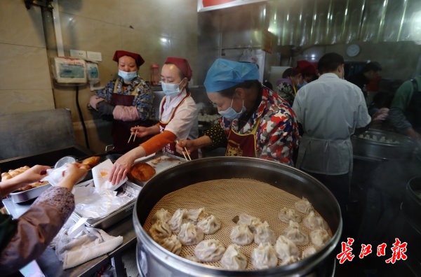 长江日报记者当日来到武昌区粮道街实地探访该店。只见小店门庭若市,食客们正排着长队有序点餐取餐。这家店店面不大,3个门面连成一体,经营面积约50平方米。店员们有的下面、有的炸油饼、有的蒸烧麦、有的冲蛋酒,大家忙而不乱。