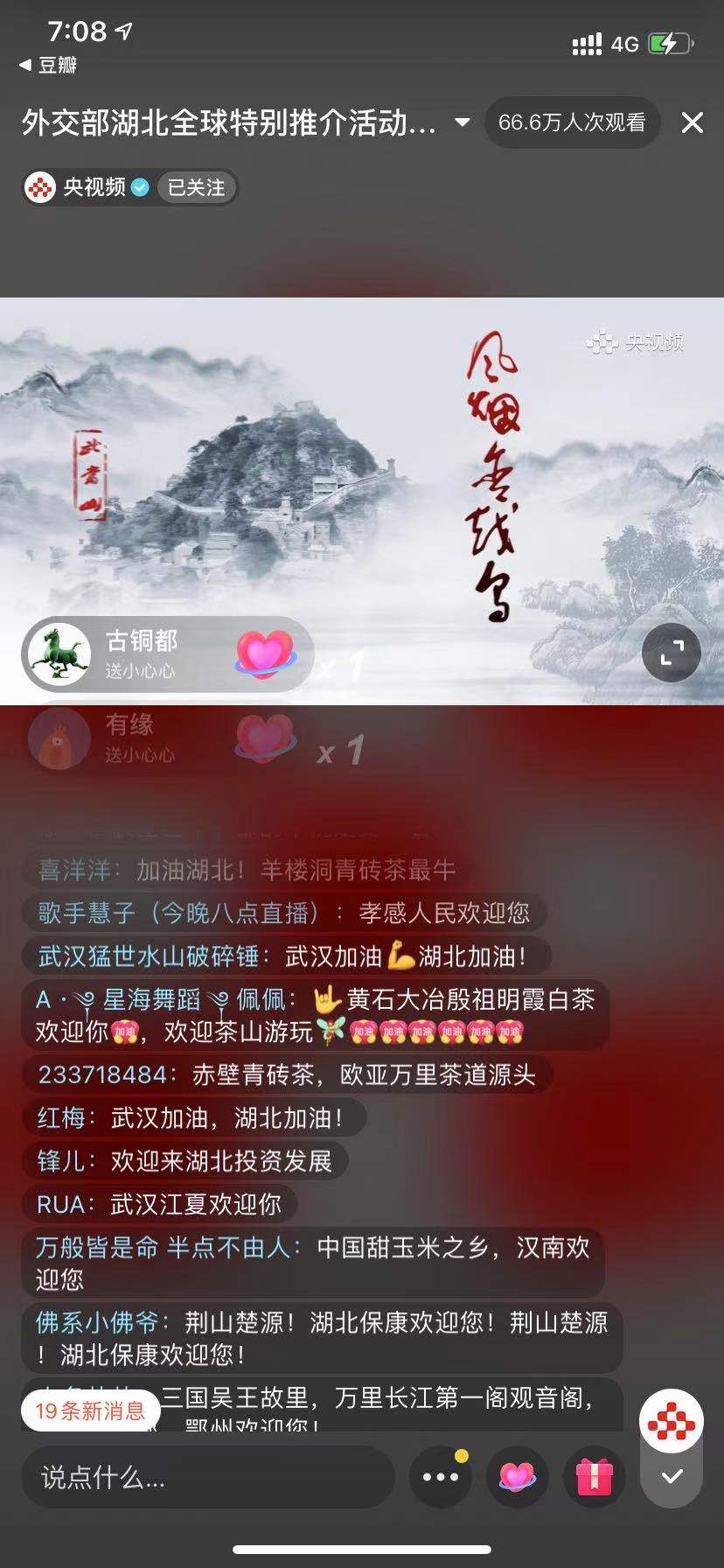 截至12日19时08分,央视频在抖音的“外交部湖北全球特别推介活动”观看人数达66.6万人次。