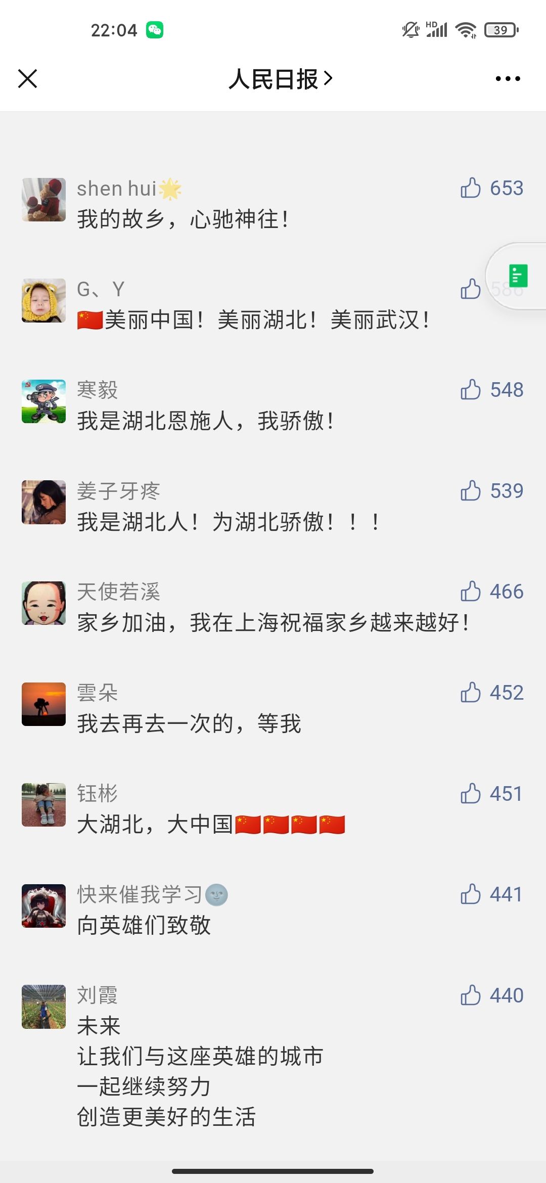 微博网友@随遇而安的老叶说:“这是一座英雄的城市,所有为之奋战的人都该被致敬、被铭记。虽然经历疫情,但武汉是一座在快速发展的、有希望的城市。祝福‘重生’的武汉,未来充满生机和活力,有更美好的明天。”