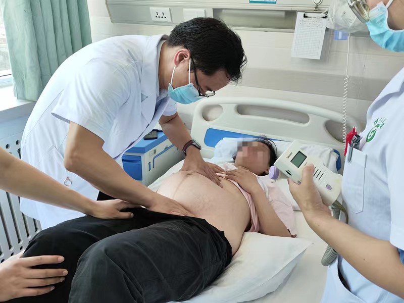 林星光医生(左)为二胎妈妈杨女士检查胎位臀位。