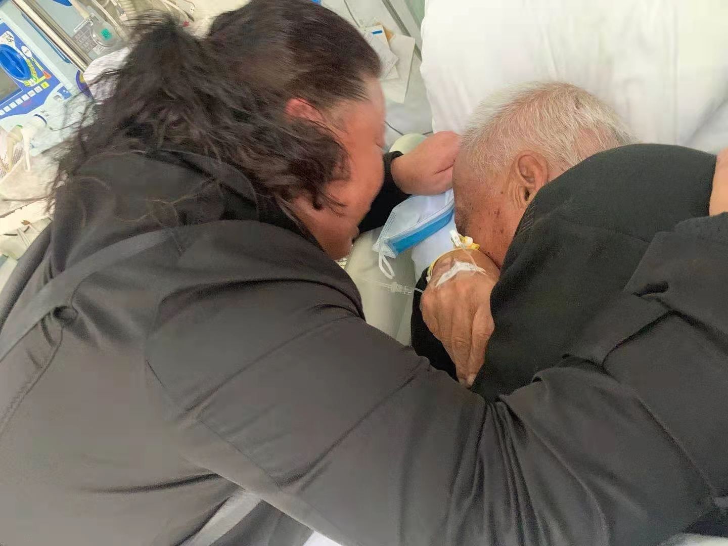 熊女士姐妹俩马上抱着老父亲,不停安抚:“爸呀,不激动不激动,我们找到你了,以后会好好照顾你,陪着你,你听医生的话,家里人都在等着你!”