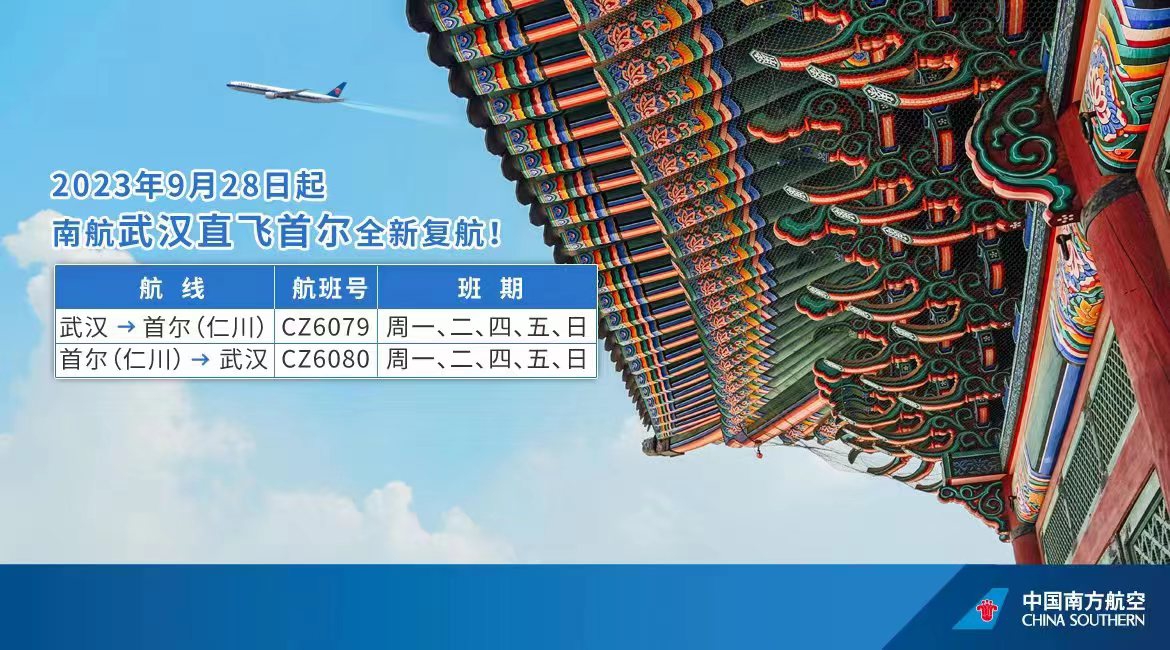 长江日报大武汉客户端8月23日讯 记者从南航湖北分公司获悉,南航计划于9月28日起,复航武汉—首尔直飞国际航线,航班号为CZ6079/80,班期为每周一、二、四、五、日,北京时间12时30分从武汉天河国际机场起飞,当地时间16时30分到达首尔仁川国际机场,当地时间17时30分从首尔起飞,北京时间19时45分达到武汉(首尔当地时间比北京时间快一小时),目前航班已上线销售。