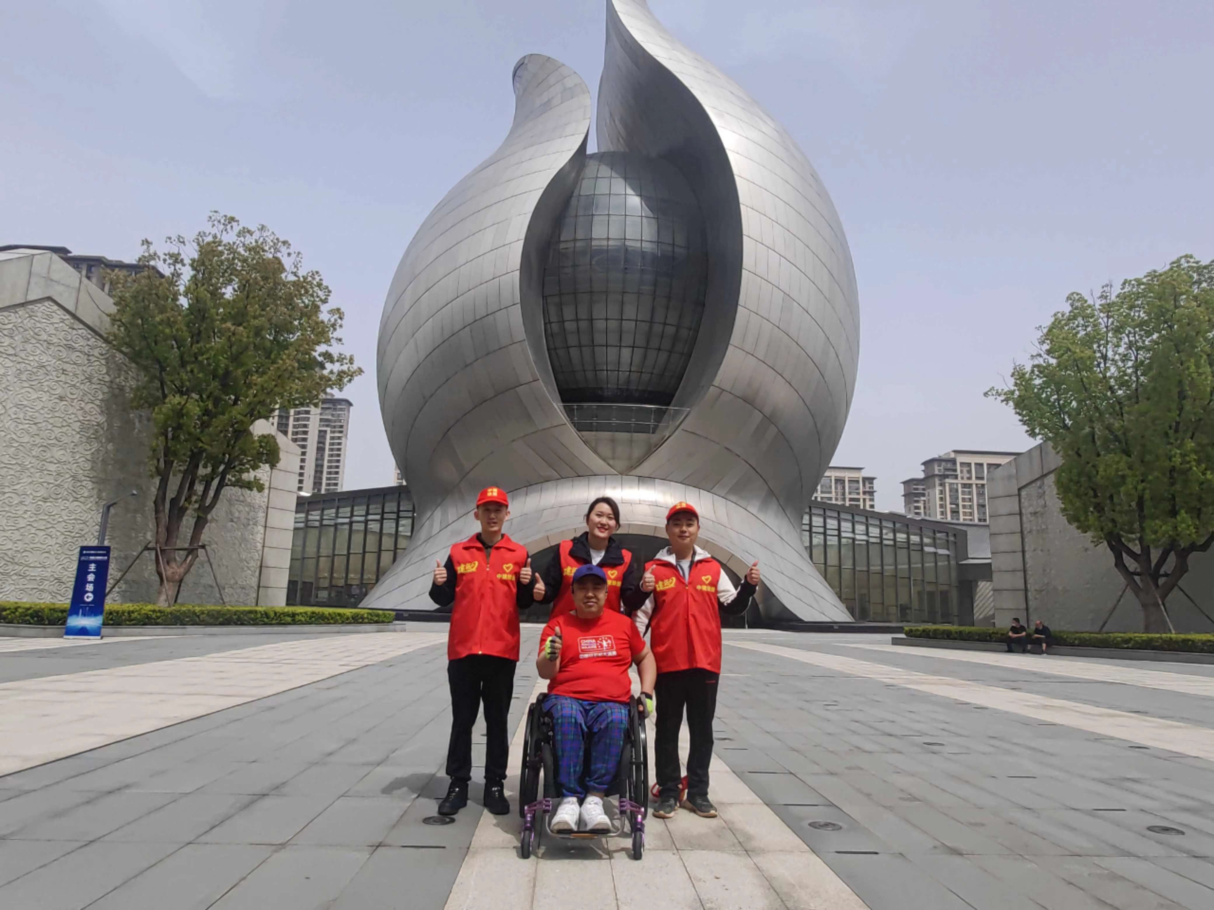 胡洁(左二)和志愿服务团队带于乐乐游武汉。受访者供图