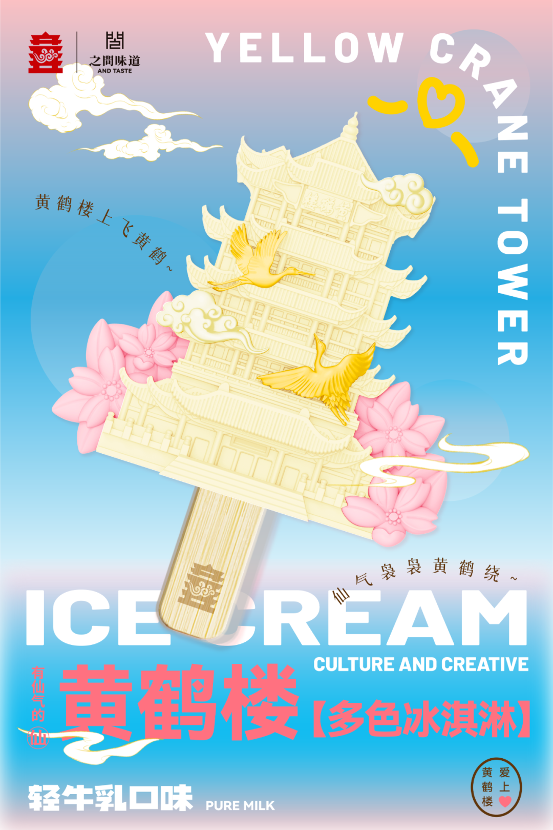 黄鹤楼多色雪糕,以乳白色为底色,白云悠悠、黄鹤围绕、梅花散落衬托,描绘出清新淡雅、诗化与美意,多姿又多彩。