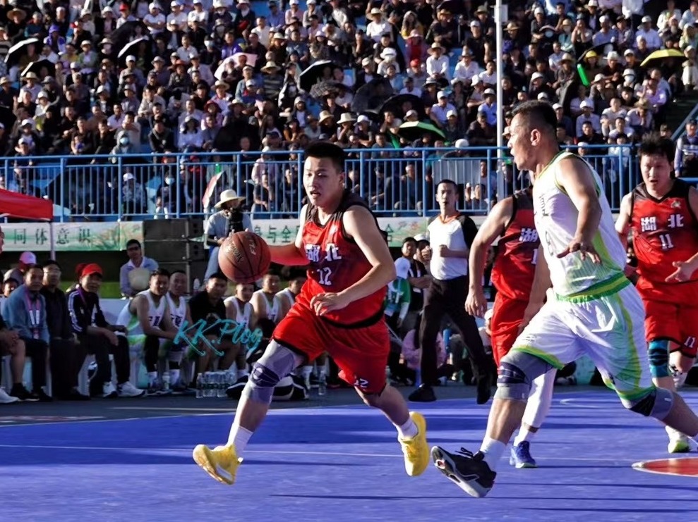 武汉新洲凤凰镇队与宁夏固原三营镇队在“村BA”比赛中。康婧怡 摄