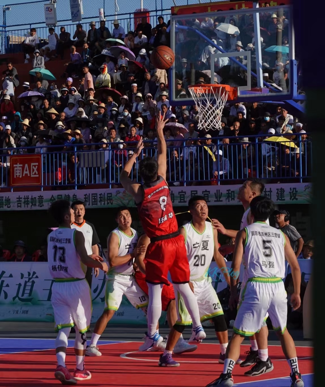 在这场比赛中,宁夏三营队的明星球员杨佰强以精准的三分牢牢控制了场上的局面,早早确立了优势。凤凰队顽强拼搏,抓住机会进行反击,9号叶濠、6号胡一鸣全力拼抢,12号刘江的多次投篮命中,5号董成伟多次突防插入对方篮下,频频拉近比分。现场解说主持也几次号召场上观众为凤凰镇队打气加油。