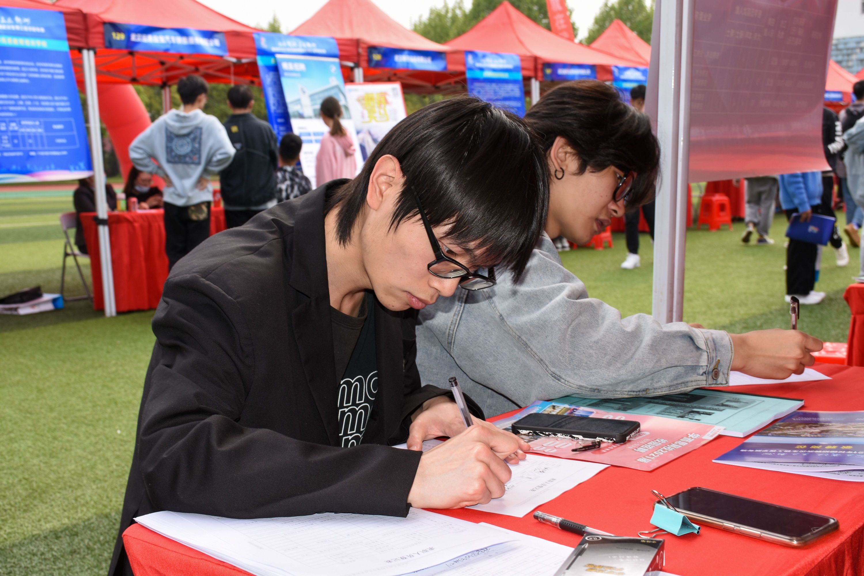 武汉生物工程学院机械制造专业大四学生何俊松听说今天有新洲专场招聘会,特地约好友时宏东赶到招聘会现场,经过对各企业认真对比,结合自己的专业,他选择向武汉飞托克实业有限公司投递简历,他说:“感觉新洲挺有发展前景的,想留下来!”
