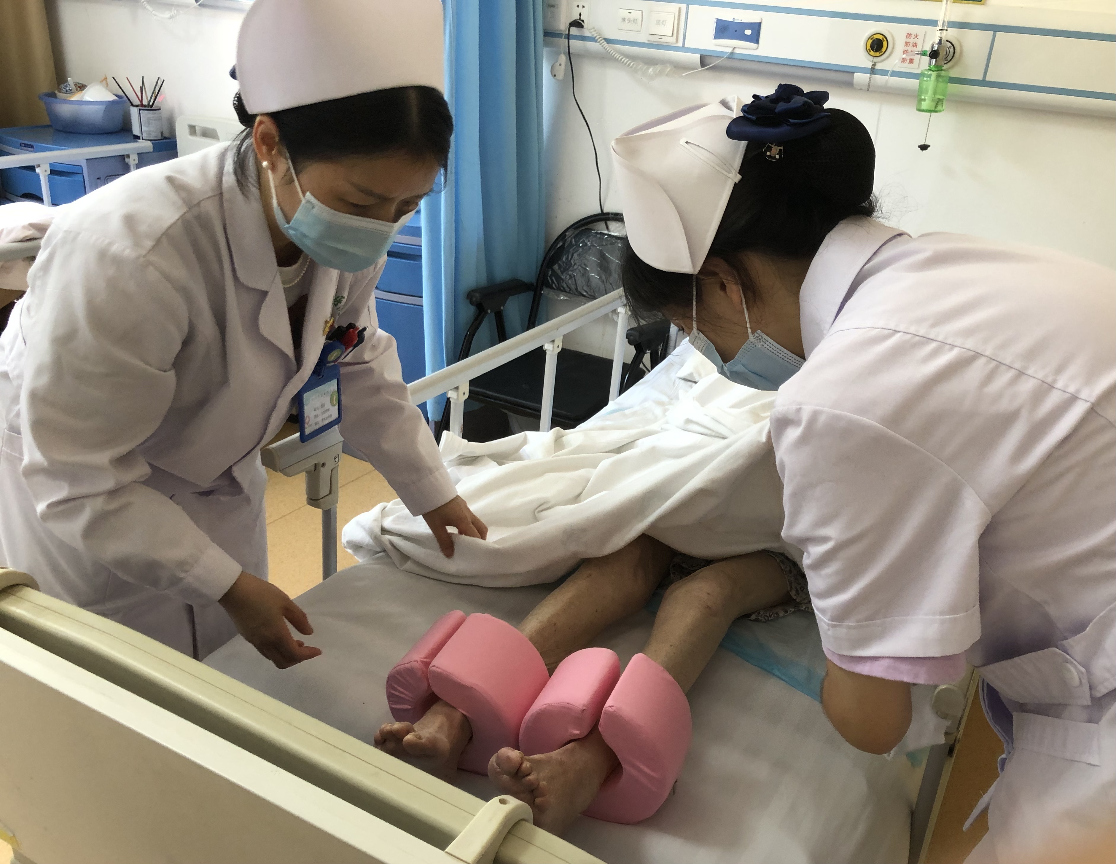 咨询第二天,王女士就带着父母一起到东湖医院老年医学科办理了住院。王女士一家一进病区,周玲就和护士们一起上前帮忙推轮椅、拿东西,将两位老人在提前安排好的病房里安顿下来,王女士看到母亲的病床上还贴心地摆放着气垫床。科主任马刚每天到病房里查房,亲手检查两老的伤口,指导治疗;管床医生徐勇喆每天认真检查病情,随时调整治疗。护士们每天为王爷爷湿敷、抬高患肢,为纪奶奶换药、定时翻身,两位老人害怕打针,年龄大,血管又细又脆,打针难度大,护士们就一边跟他们聊天转移注意力,一边迅速将针打进去,每次都是一针见血。王爷爷有老年痴呆,第一天晚上输液,他就把输液针头拔掉了4次,护士韩秀华耐心地哄着他,直到治疗顺利完成;有一次王爷爷把床尿湿了,护士武凯丽发现后立即将床垫进行了更换,还叮嘱说“爷爷,以后记得喊人啊”,王爷爷自己都不好意思地笑了。护士张明霞对纪奶奶多次反复进行压疮护理的宣教,还在饮食上进行指导。