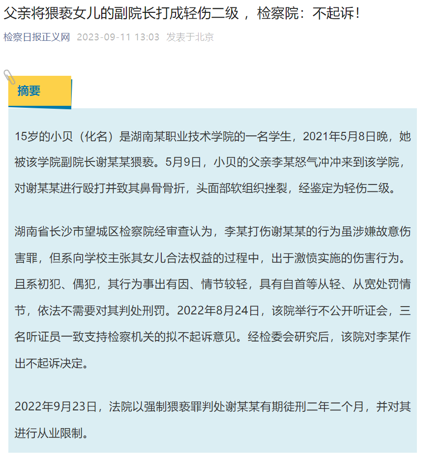 日前,《检察日报正义网》报道了一起案件。湖南某职业技术学院一副院长猥亵女学生,被该学生父亲打伤,最终检方对学生父亲作不起诉决定。