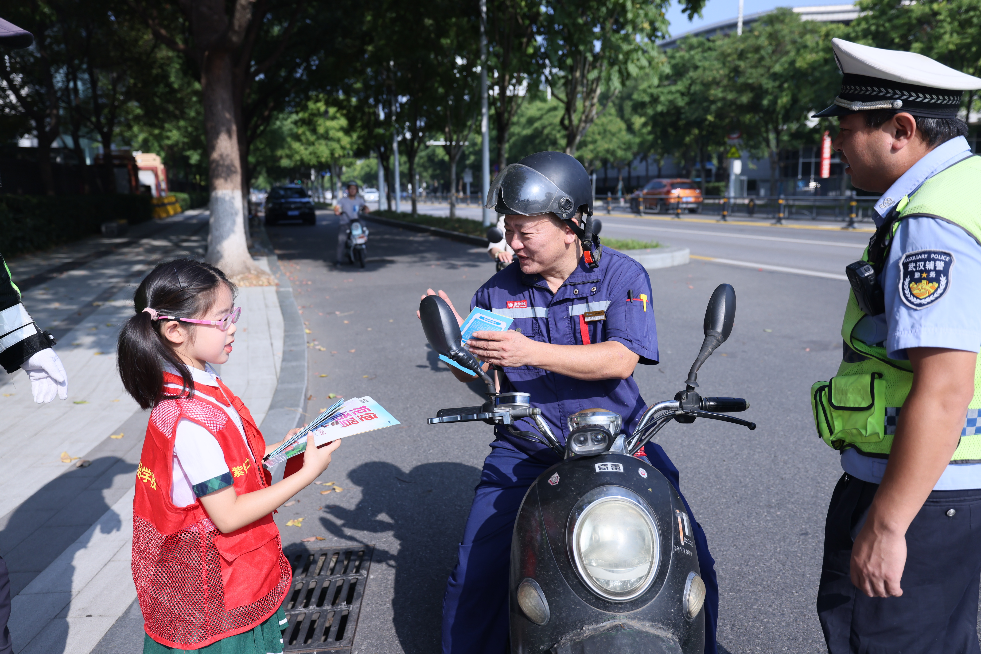“阿姨,请戴好头盔哟,安全文明出行!”清晨9时许,一名电动自行车驾驶员因为没有戴头盔被路口执勤的民警拦下,学生主动上前进行宣传劝导。在路口另一个方向,“汉警快骑”队员指着宣传展板,向学生介绍“电动自行车违法‘十必查’的有关内容”等,提醒他们注意日常交通安全。