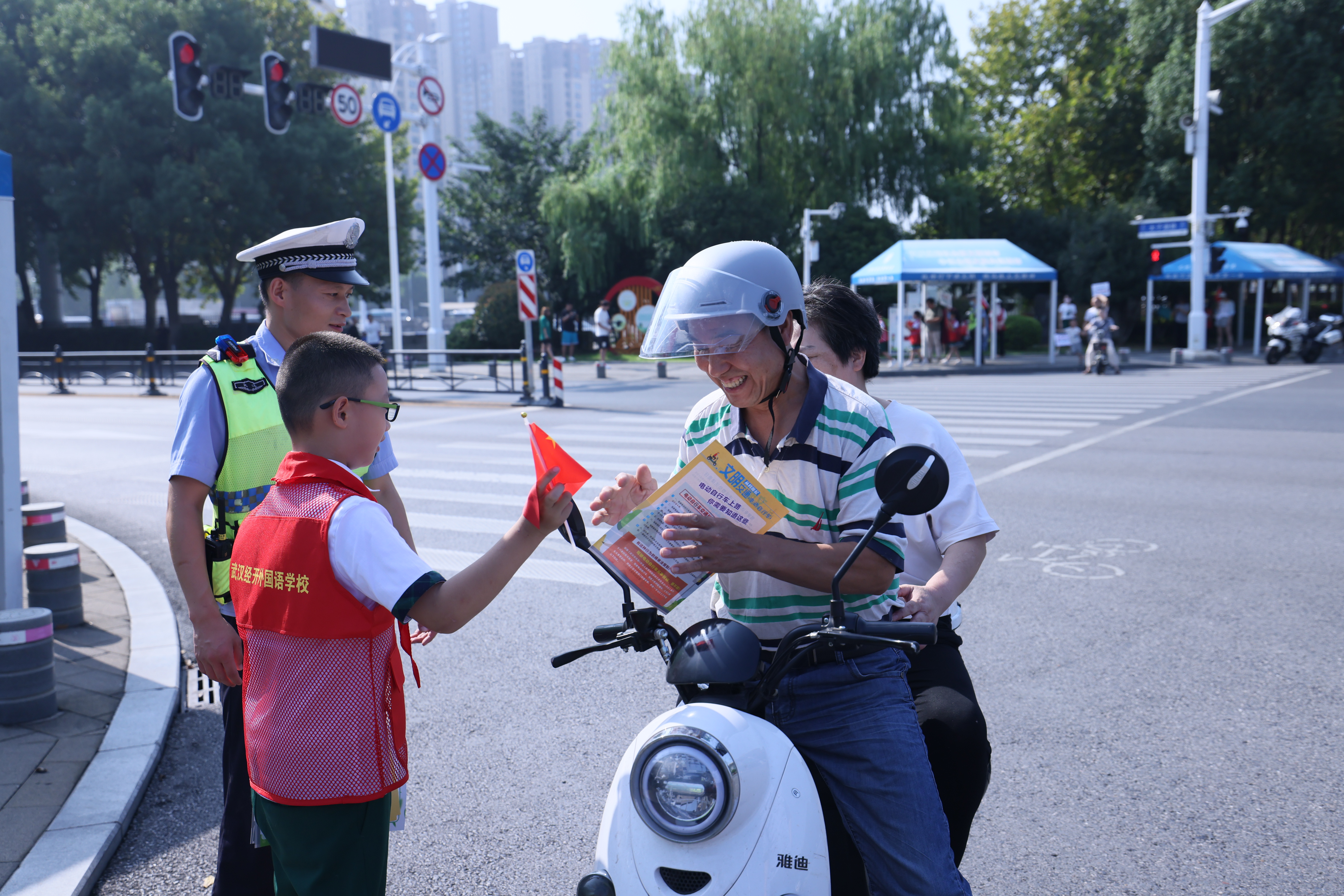 活动中,学生在民警的带领下,在家长、老师的监护下,分组在太子湖路体育路路口的四个方向,通过吹口哨、摇红旗、发放宣传单等方式,参与交通安全宣传劝导实践活动,路口还摆放有“一盔一带”“禁止酒驾”等交通安全宣传展板。