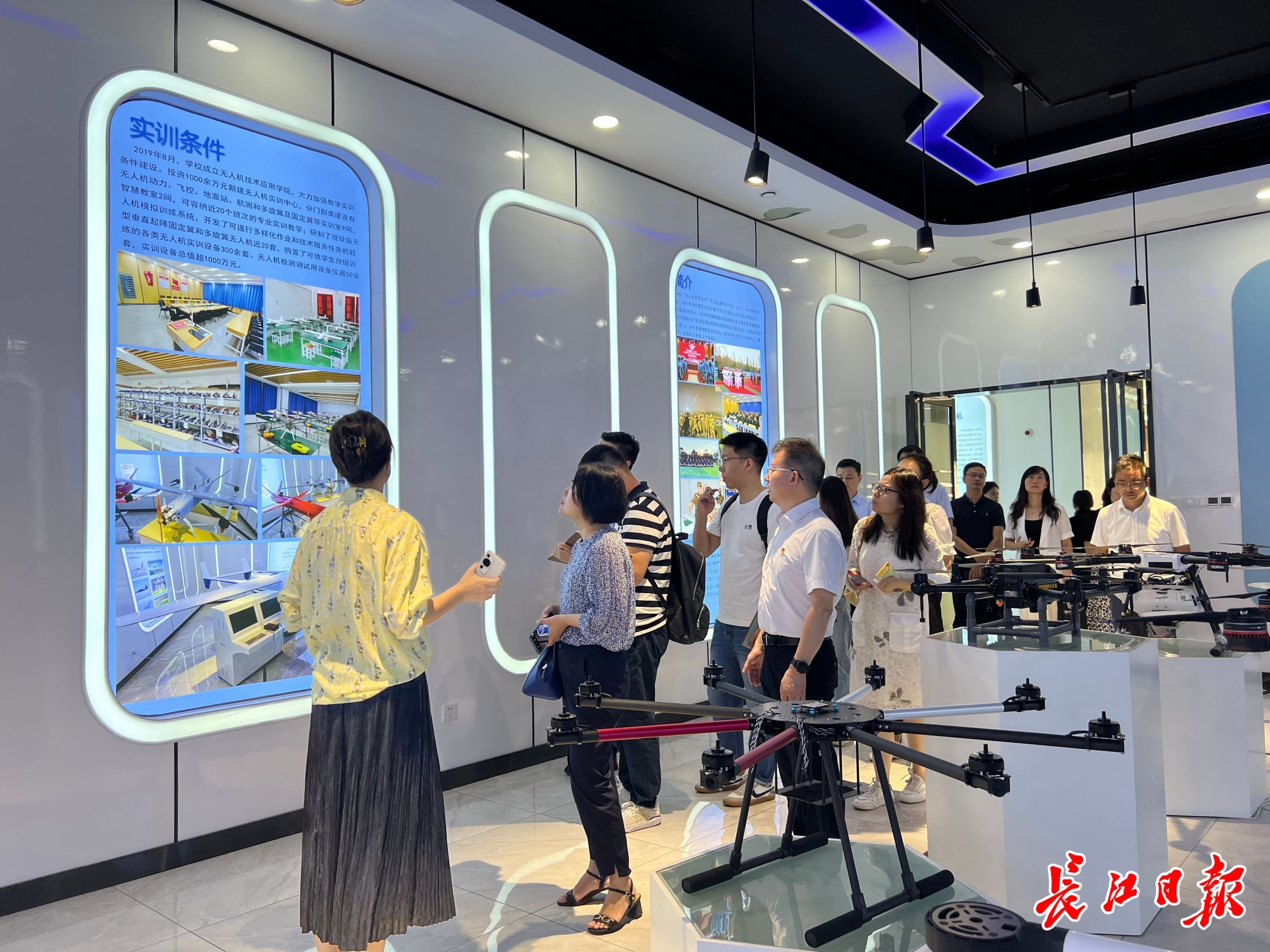 汤逊湖边,高校集聚,在调研的第二站——武昌职业学院实训场地里,学子们从容地操作摇杆,无人机瞬间腾飞。而在距离学校约10分钟车程、占地面积80亩的校办工厂里,航空航天零部件生产线一片繁忙。