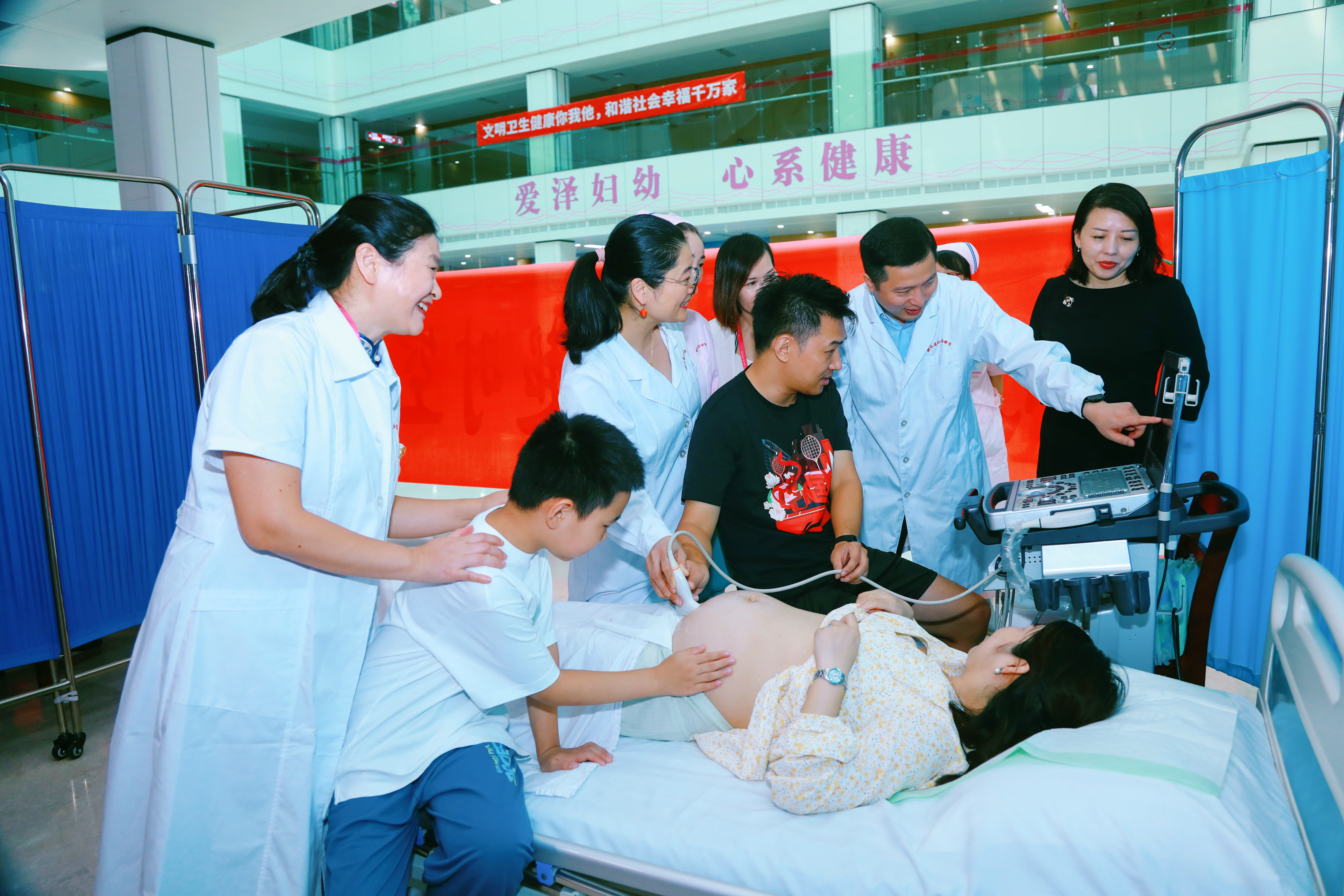 现场,专家握着市民陈先生的手,一边指导他给妻子做超声检查,一边讲解超声影像。陈先生第一次在超声仪器上看到自己宝宝的样子,身边大儿子在检查床边抚摸着妈妈的肚子,好奇地看着这个家庭的“新成员”,一家人与宝宝说“嗨”,沉浸在爱的喜悦中。