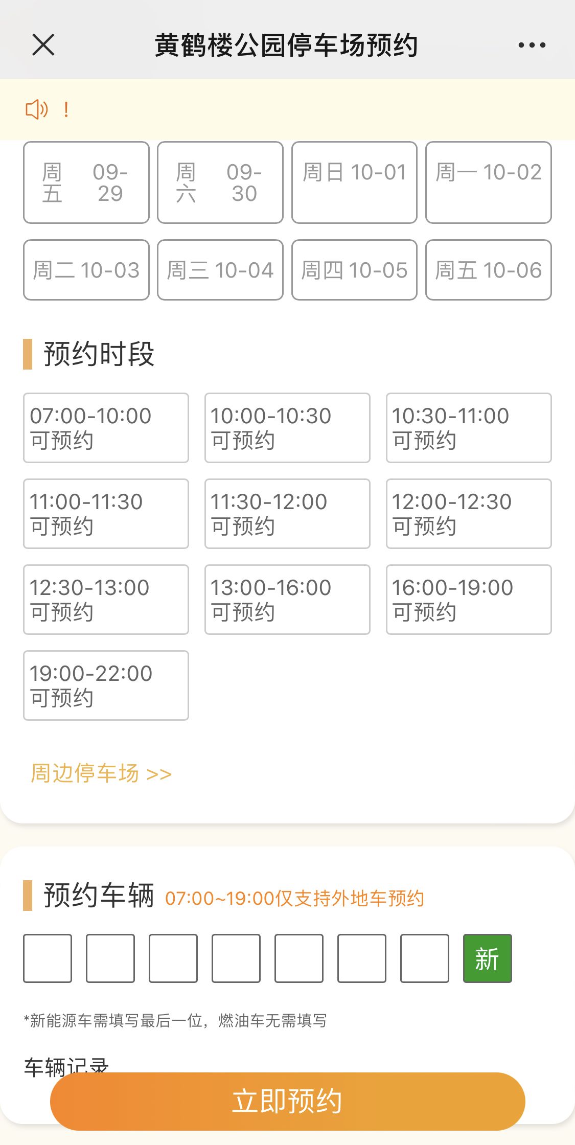 黄鹤楼景区车辆预约支持9月29日—10月7日期间3天内的行程,全天24小时未预约车辆不得进入黄鹤楼景区停车场。当天一个用户仅支持为一个车牌预约,同一个用户或同一个车牌当天仅可存在一个未使用预约。