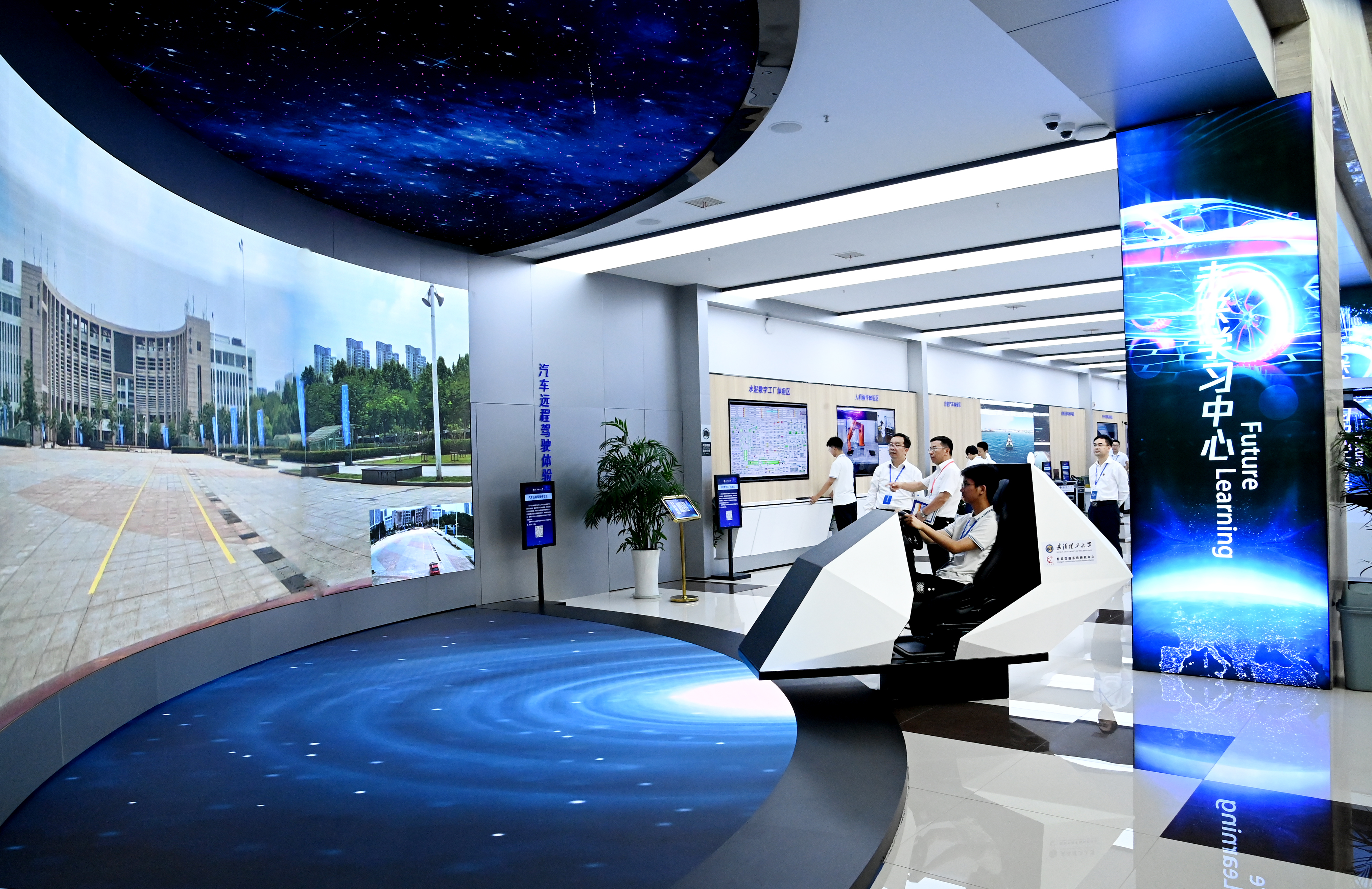 记者现场看到,未来学习中心还包括智能汽车体验区、水泥数字工厂体验区、汽车远程驾驶体验区、光纤传感网络体验区、数字化创新创业体验区等。在汽车远程驾驶体验区,记者看到屏幕右下角有一辆红色的车正在广场上行驶,车内无驾驶人员。这是一台远程操控车辆,学生在体验区远程操作转向盘和踏板,就可以控制广场上的红色车辆。该系统主要利用5G与人工智能技术实现汽车远程驾驶体验,通过采集运行环境视频,多通道展示实际驾驶场景,适用于矿井、隧道、有毒有害等不适合人类驾驶的恶劣环境中。