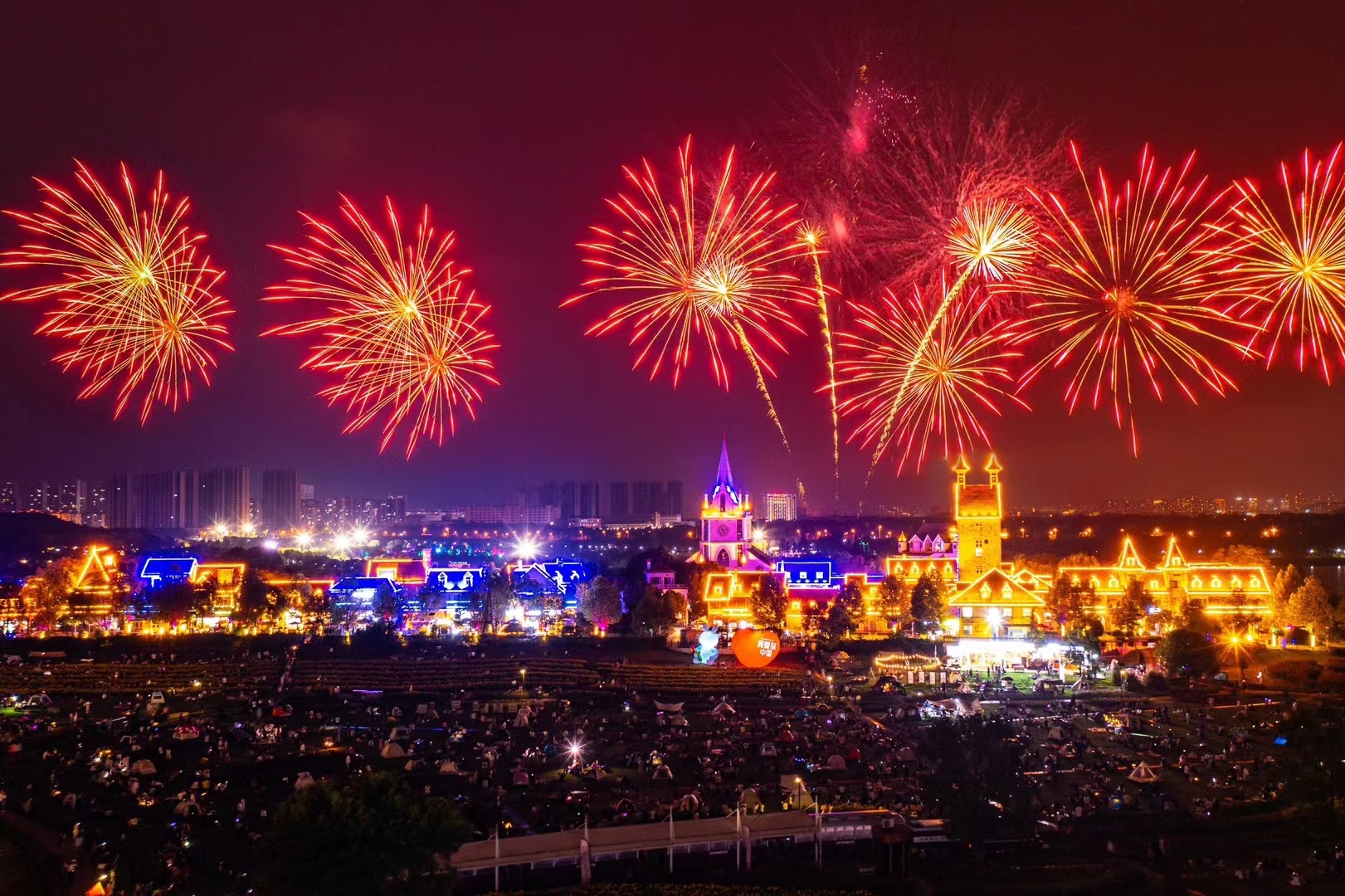 假日期间,武汉不少乡村景区推出了烟火剧场秀活动,伴随着灯光、音乐和表演,在绚烂的烟火中为祖国送上祝福。