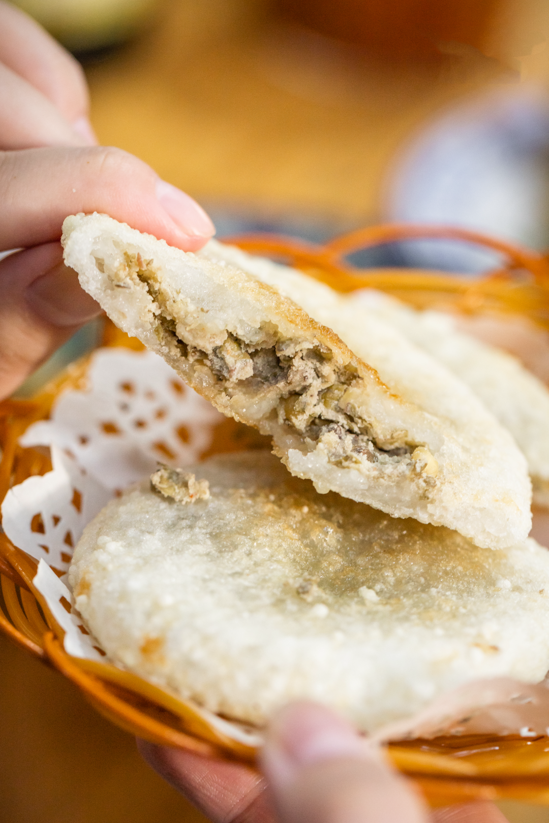 被清水充分浸泡的糯米和绿豆,上锅蒸得粉糯,再将蒸熟的糯米用特制工具揣得细润黏糯,包上煮熟的绿豆做成饼状放入锅中油炸。