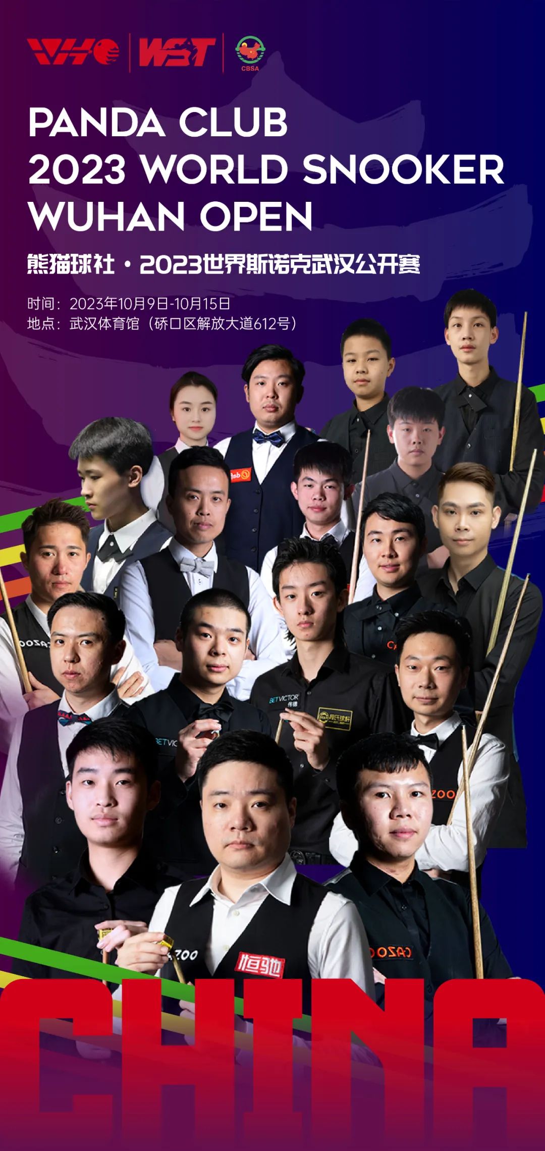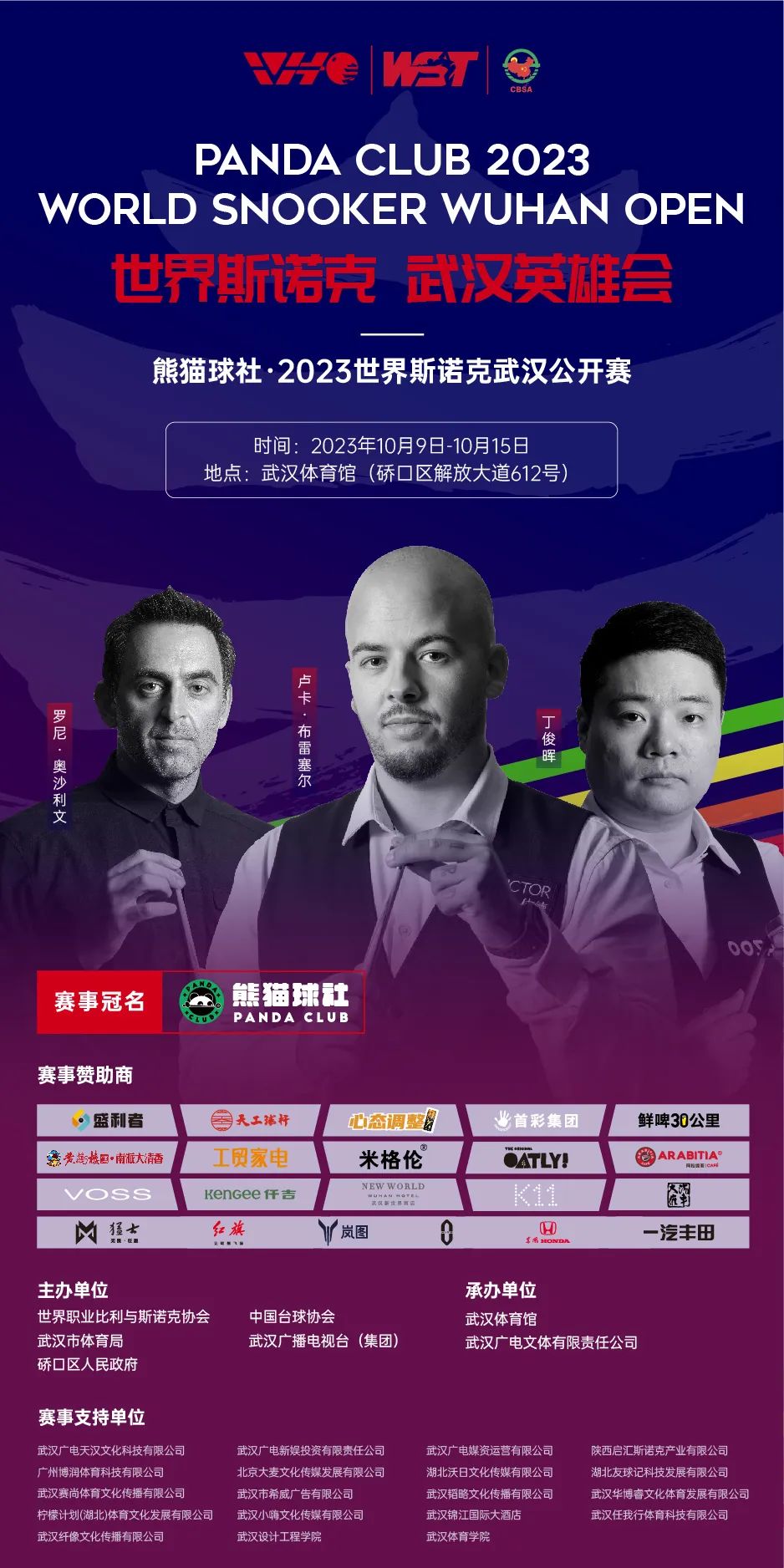 本站比赛一共有72名高手参赛,世界TOP16名中的大部分选手都将来汉,其中包括新科世锦赛冠军“比利时子弹”布雷塞尔、斯诺克球王“火箭”奥沙利文、中国“一哥”丁俊晖、“希望之星”斯佳辉等。