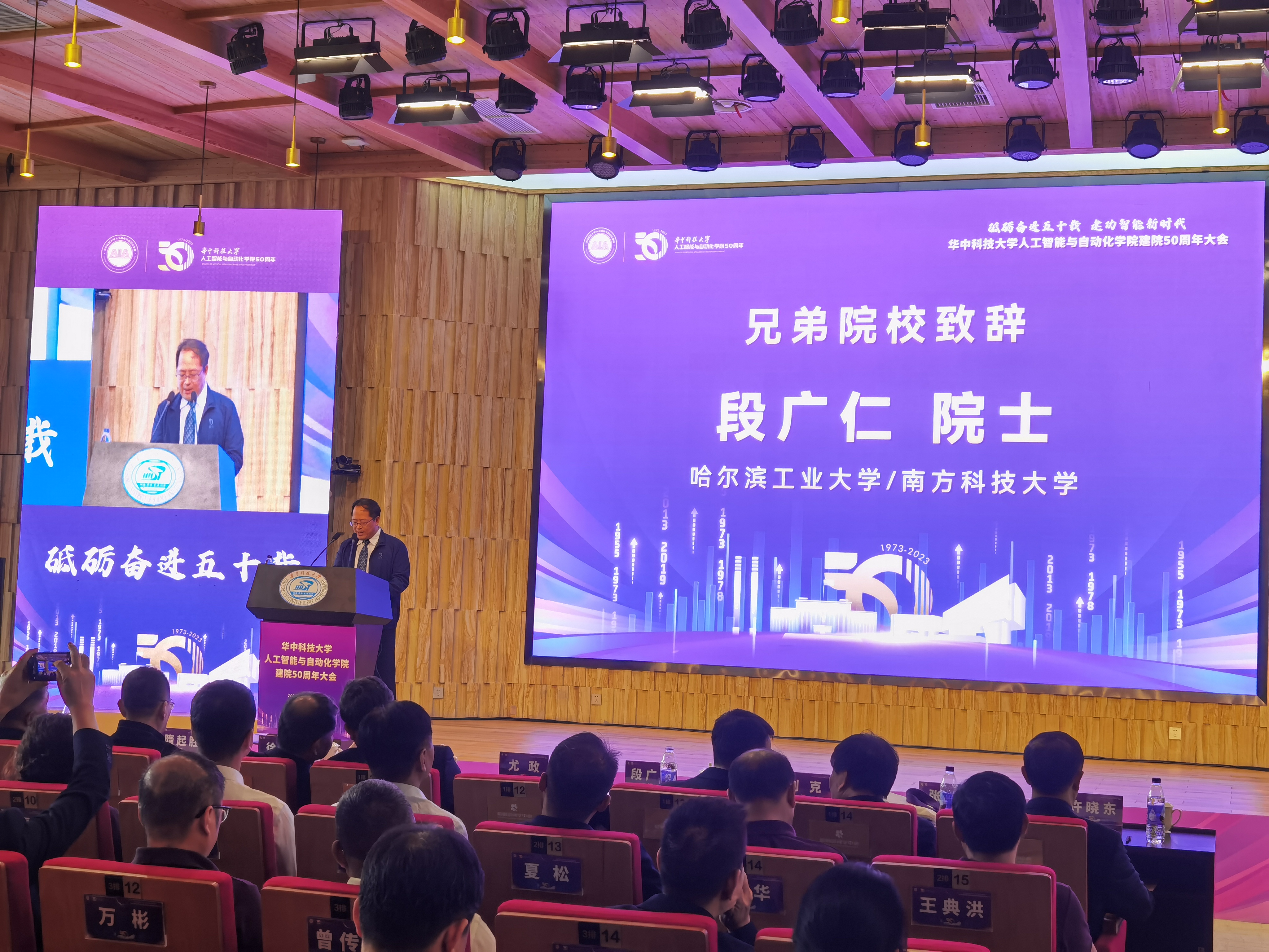 哈尔滨工业大学、南方科技大学段广仁院士作为兄弟高校代表致辞,他从三个方面强调了人工智能与自动化领域在新时代的重要性,寄语华科大人工智能与自动化学院能够继续体现办学特色,承担人工智能与自动化领域创新人才培养重任,持续在国内外产生重要影响。