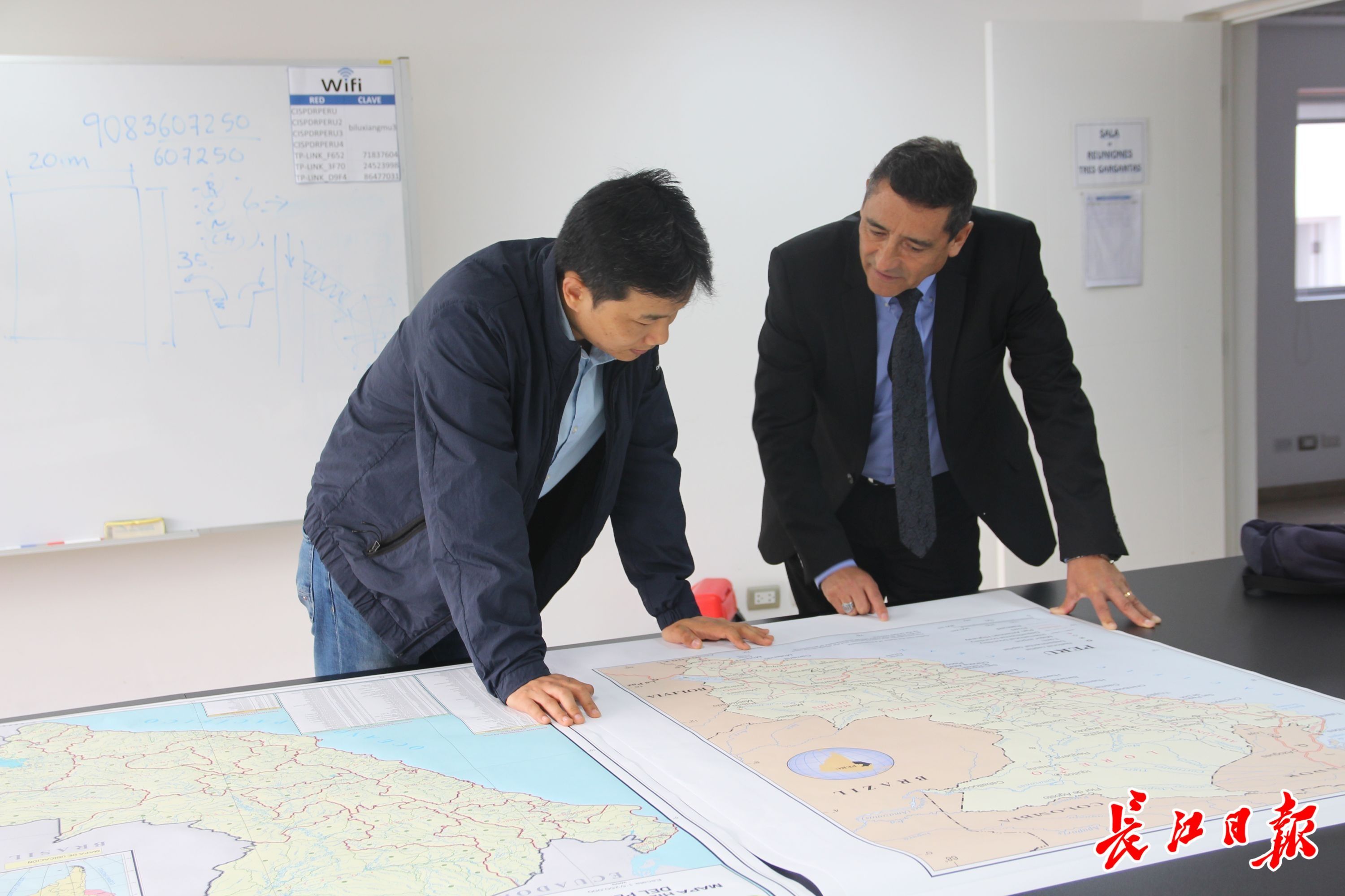 王杰(左)和马可·安东尼奥·努涅斯一起研究秘鲁河流水系。长江日报特派记者 张维纳 摄