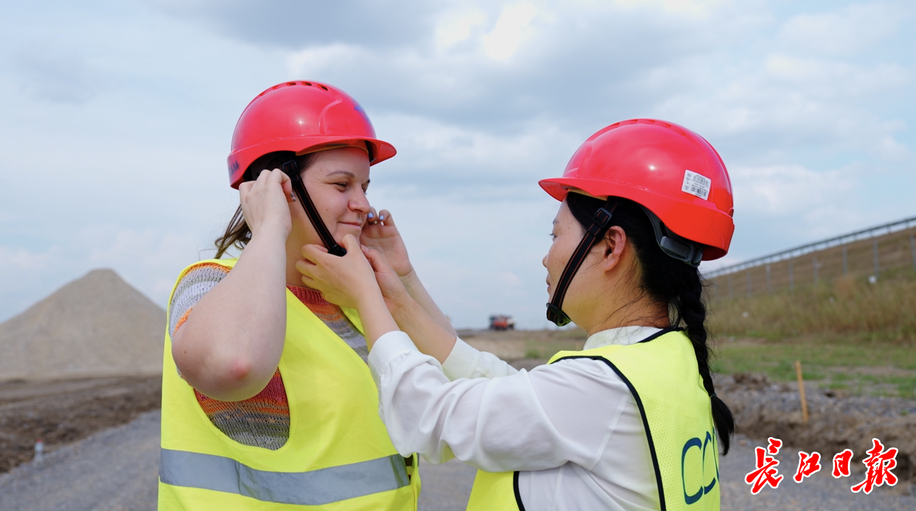 李杰(右)在项目现场给李娜整理安全帽。长江日报特派记者 范芃 摄