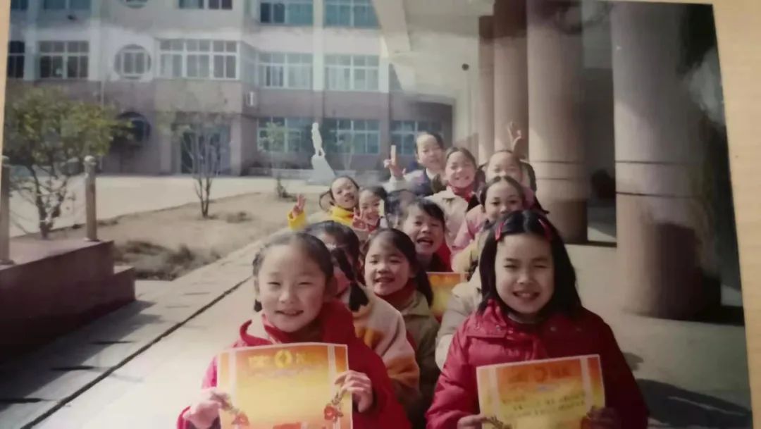 孙莉琴老师留存的照片,上图王霜开心做出胜利的手势(从上往下第二排中为王霜)。学校供图