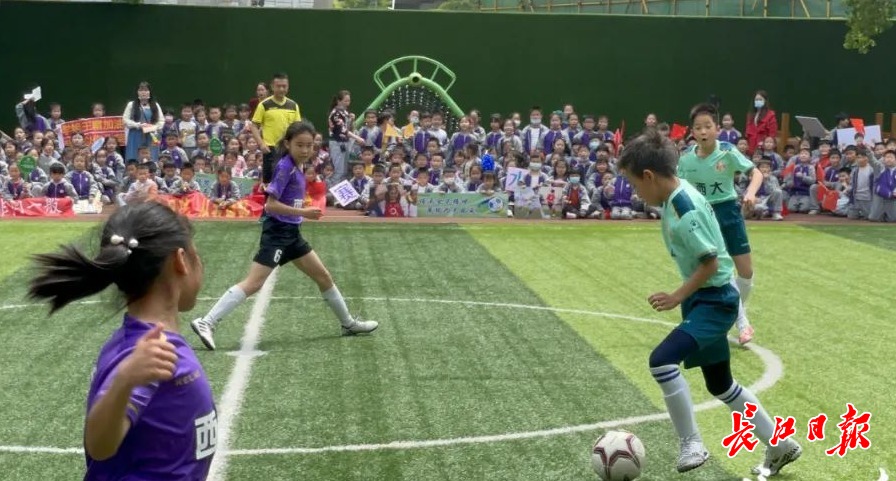 4月15日,在武汉市汉阳区西大街小学2021年校园足球联赛上女足队与男足队同场竞技。长江日报记者杨幸慈 摄