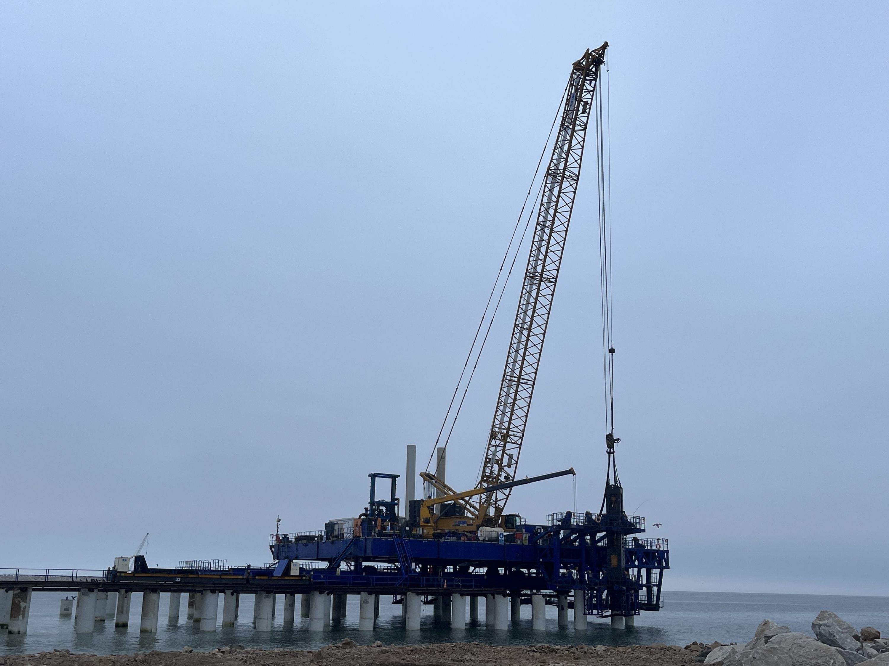 面对无法改变的自然条件,项目团队革新传统技术,为钱凯港项目量身研制了一套海上打桩“神器”——移动打桩平台,变水上施工为陆上施工,不受海浪影响,随时打桩。