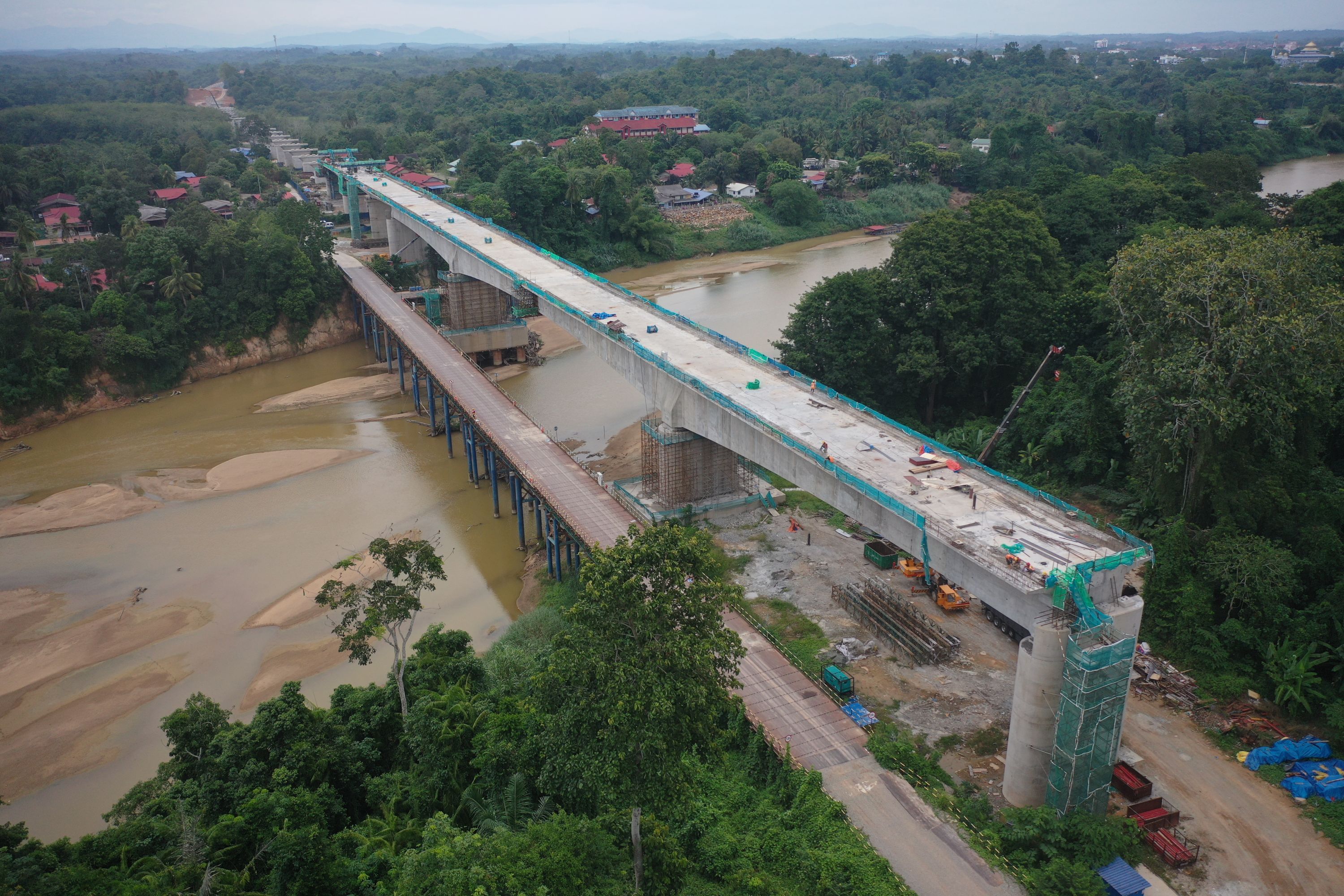 马东铁路六分部跨彭亨河特大桥施工现场。