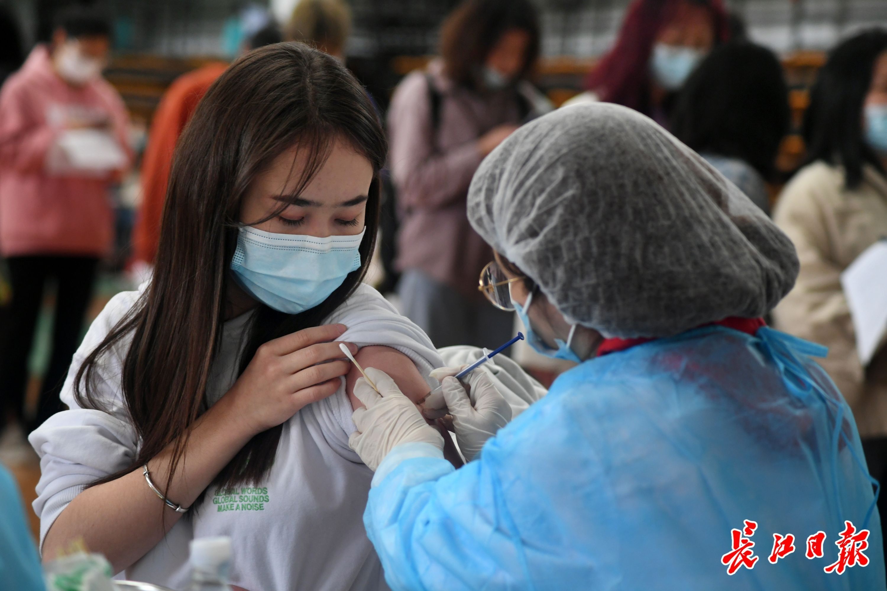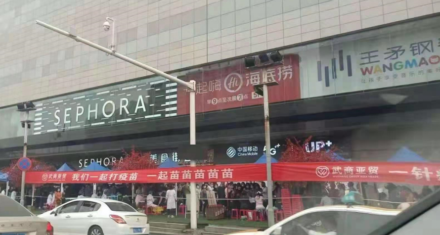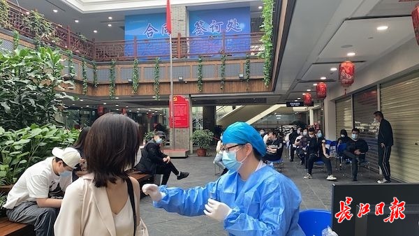 不少市民在汉街排队接种疫苗