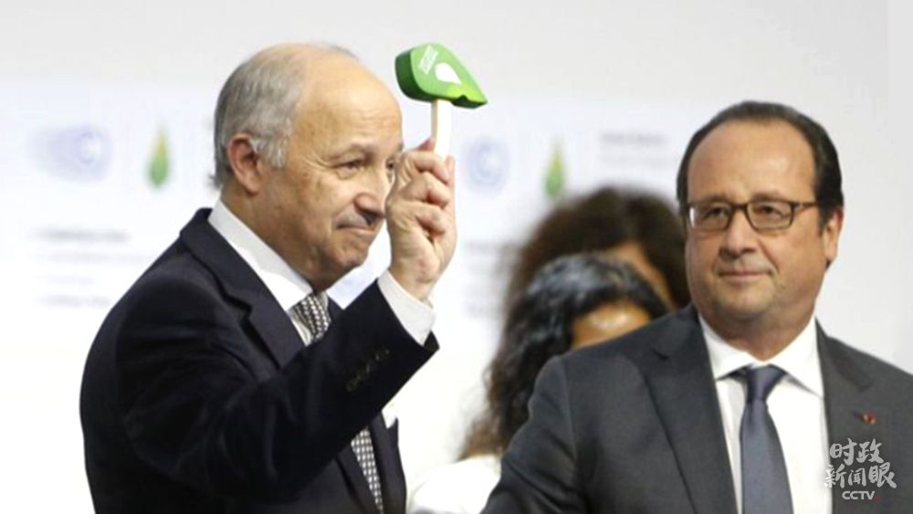2015年12月12日,巴黎气候变化大会主席、法国外长法比尤斯举起带有大会标志的绿色小锤,宣告里程碑式的《巴黎协定》诞生。(资料图)