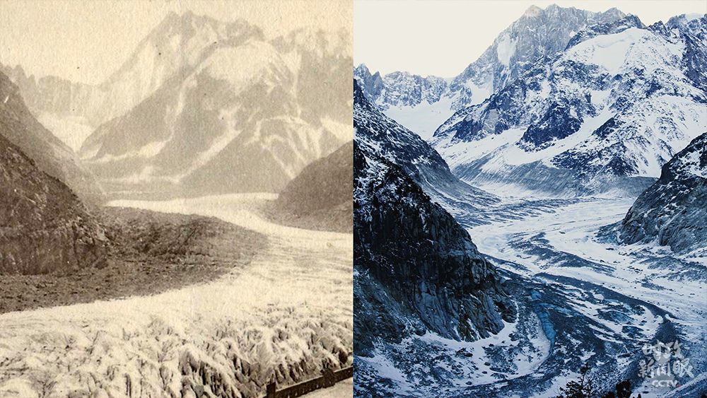 去年2月,马克龙总统到访位于法国阿尔卑斯山勃朗峰山区的冰海冰川。作为法国最长的冰川,近些年它因全球暖化而急剧萎缩。这是马克龙总统在个人社交媒体上发布的冰川消融对比照片(左为1910年,右为2020年)。