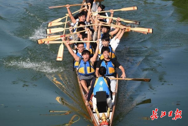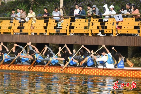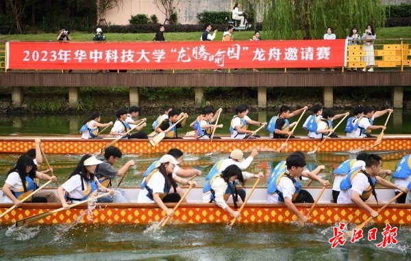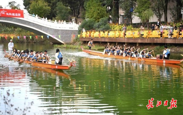 长江日报大武汉客户端10月21日讯 10月21日下午,华中科技大学的湖溪河两岸,“加油”呐喊声此起彼伏。华中科技大学第一届“龙腾喻园”龙舟邀请赛暨首届华中科技大学龙舟文化节在此举办,13个院系200余名本科生、研究生组成的12支代表队在湖溪河上劈波斩浪竞技角逐。今年9月《龙腾喻园》列为学校“双一流”建设文化品牌重大立项项目,龙舟文化受到众多学生的喜爱,学校每年从新生中选拔优秀队员充实华科龙舟队。