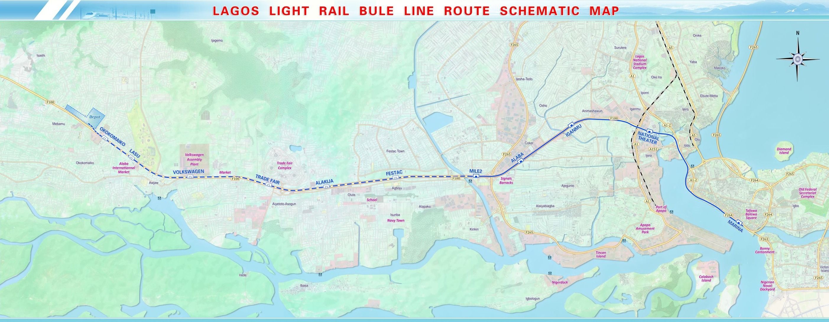 尼日利亚拉各斯轻轨蓝线一期,是西非第一条电气化城市轻轨,也是非洲第一条跨海铁路。它横穿西非第一大城市拉各斯南部,改善了当地落后拥堵的交通,降低了通勤成本。