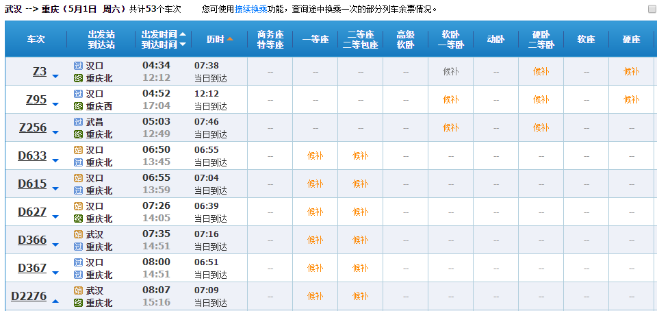 武汉至重庆车票销售火爆。 12306截图
