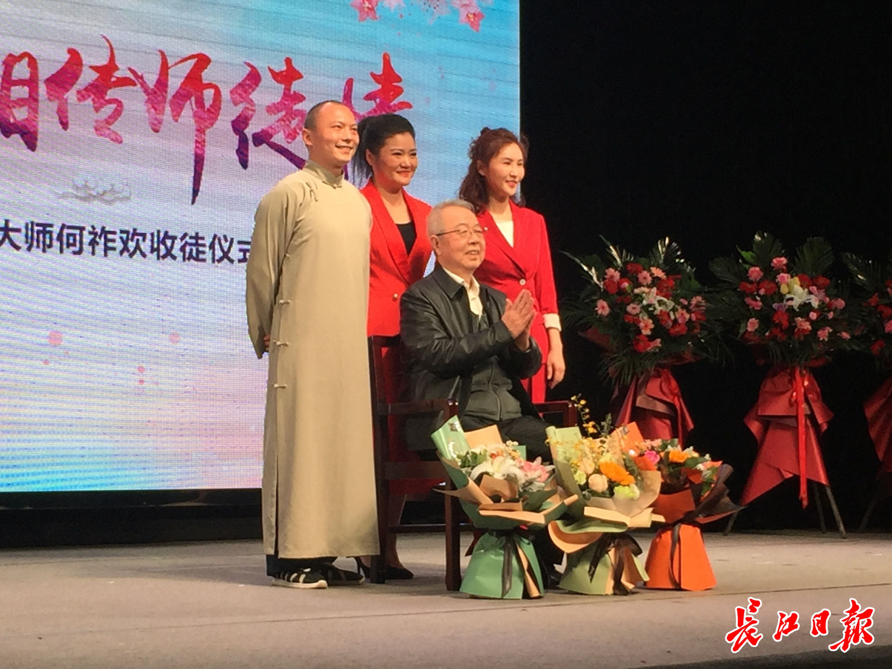 长江日报讯 “大师开口楚天惊,薪火相传师徒情。”4月17日晚,著名评书表演艺术家、湖北评书大师何祚欢喜收三位徒弟,收徒仪式在武汉说唱团都市茶座剧场举行,武汉市文艺界人士和数百位曲艺爱好者见证了收徒全程,并观赏了何祚欢门下多位弟子的精彩表演。