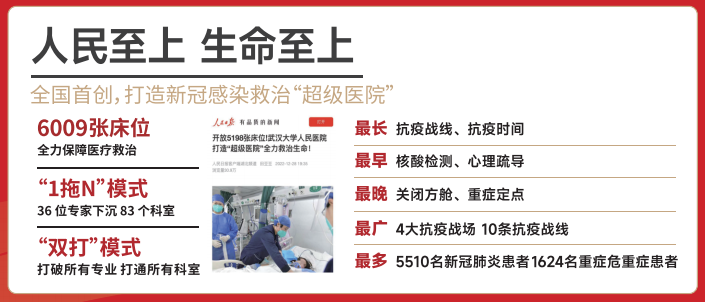2022年底,人民医院在全国首创“超级医院”双打通(打通学科、打通专业)救治模式,超负荷开放6000余张床位,应收尽收,应治尽治。并组织近百支医疗队,先后驰援多地,获得各级党委政府和人民群众高度赞誉。