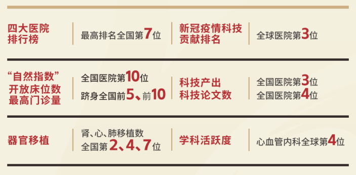 医院临床学科齐全,医疗服务量位居全国前10,覆盖全国、辐射全球。医院入选“国家疑难病症诊治能力提升工程”、首批“国家中西医协同旗舰医院”,在四大医院排行榜上最高位列全国第7位。