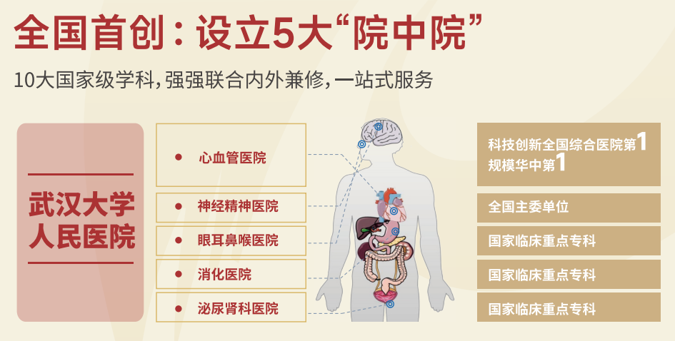 医院提出“对内改革、对外开放”的创新发展战略思路,以国家级重点学科和国家临床重点专科为核心,创新组建成立了心血管医院、神经精神医院、眼耳鼻喉医院、消化医院、泌尿肾科医院等5大“院中院”。