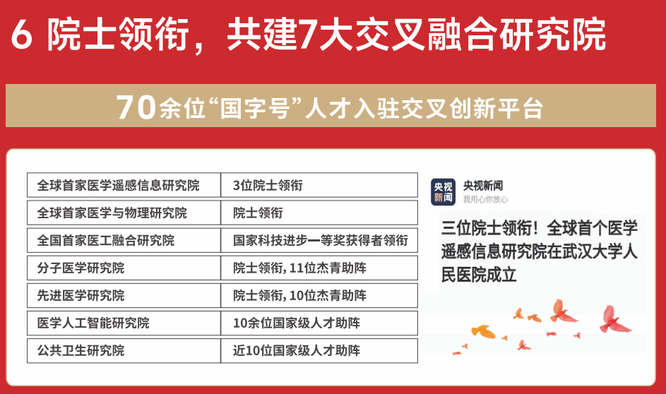 医院与武汉大学世界顶尖学科的6位院士合作,70余位国字号人才参与共建包括全球首个医学遥感信息研究院,全国医院首个医工融合研究院、医学人工智能研究院等7大交叉融合研究院,并研发了全球首颗医学遥感卫星“武汉大学人民医院健康号”,即将发射升空。