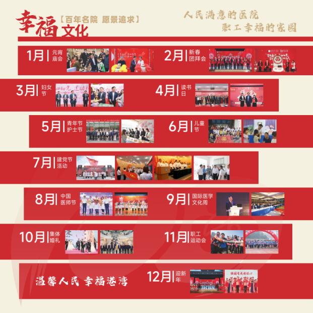 “幸福”,就是坚持以人为本,共建“温馨人民 幸福港湾”,努力打造“人民满意的医院 职工幸福的家园”。人民医院致力于培育“有益于人才培养、有益于事业发展,有益于职工幸福、让医院的发展更有方向感、工作更有成就感、生活更有幸福感、职工更有归属感、年轻人更有希望感”的医院文化。医院主题文化活动覆盖全年,全生命周期关爱每一位职工,让每一位“人民人”感受到家的温暖,形成了独具医院文化魅力、备受大家期待、寄托美好祝福的幸福文化。
