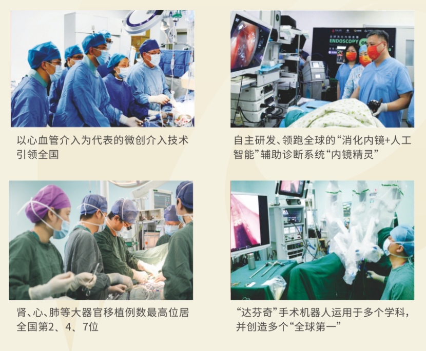 医院在微创诊疗、器官移植、生殖医学、智慧医疗、心身医学等领域贡献卓越,在医学史上创造了许多世界纪录、亚洲纪录和中国纪录,开创世界首例睾丸移植、胎儿肾上腺移植等。