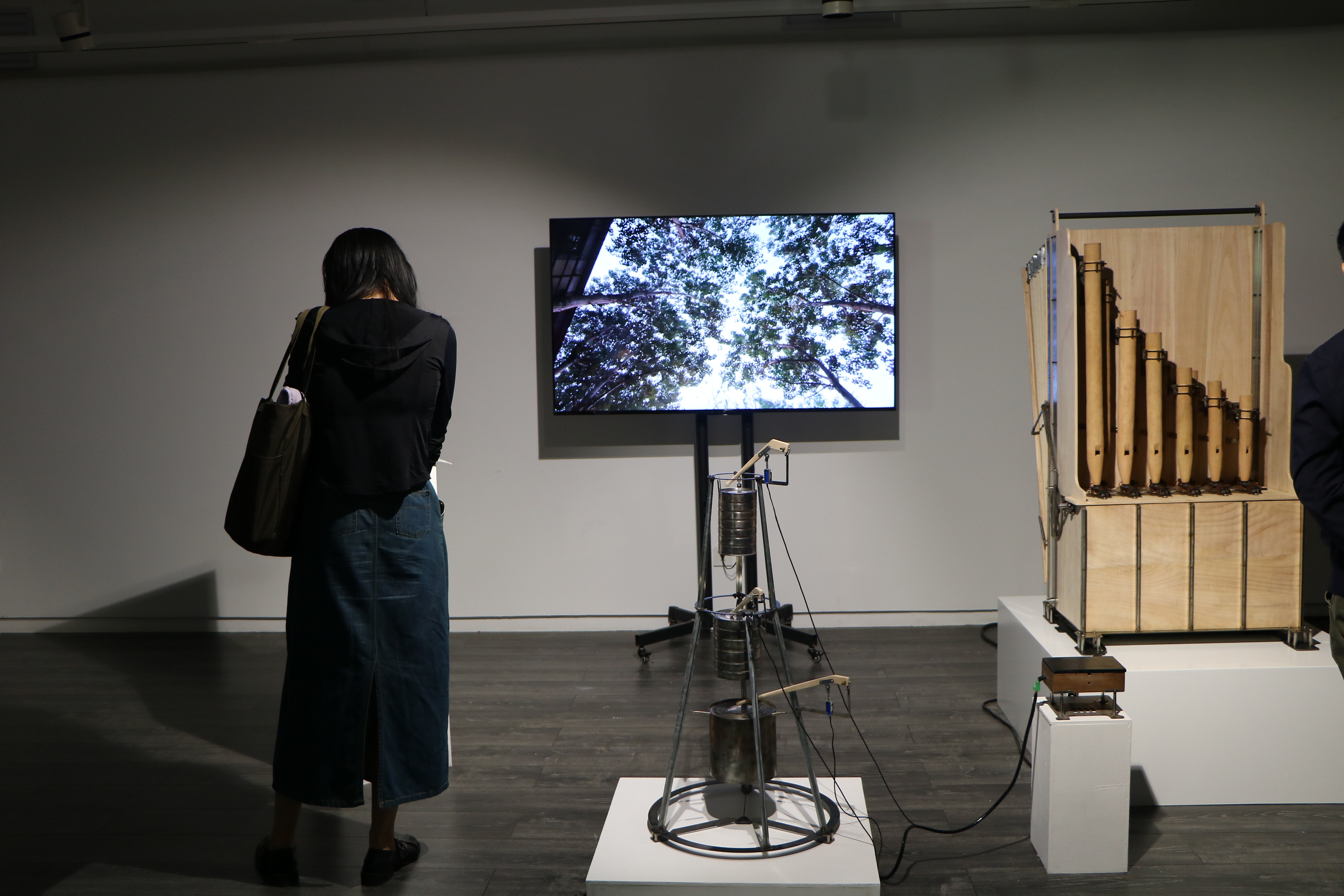 与传统艺术静态观赏不同的是,新媒体艺术展最强调的是体验感和互动性。中央美术学院学生王梦瑶的作品《回声奥德赛》分为表演和VR互动装置两个部分,采用沉浸式交互体验,探索身体和意识的关系。湖北美术学院学生胡森的作品《TA》通过气味与图像表现并放大“阿尔茨海默病”患者在患病时出现记忆消退症状的过程。机械臂成为患者主体,TA反复书写“我”这个文字的行为,重现患者在患病时不断回忆抓取自己遗失的记忆的过程,被墨染黑的水讲述最终患者的意识陷入混沌。通过中央美术学院学生王和的作品《郊游 Outing》,观众可体验到仿生的自动化乐器组成的“机械剧场”。