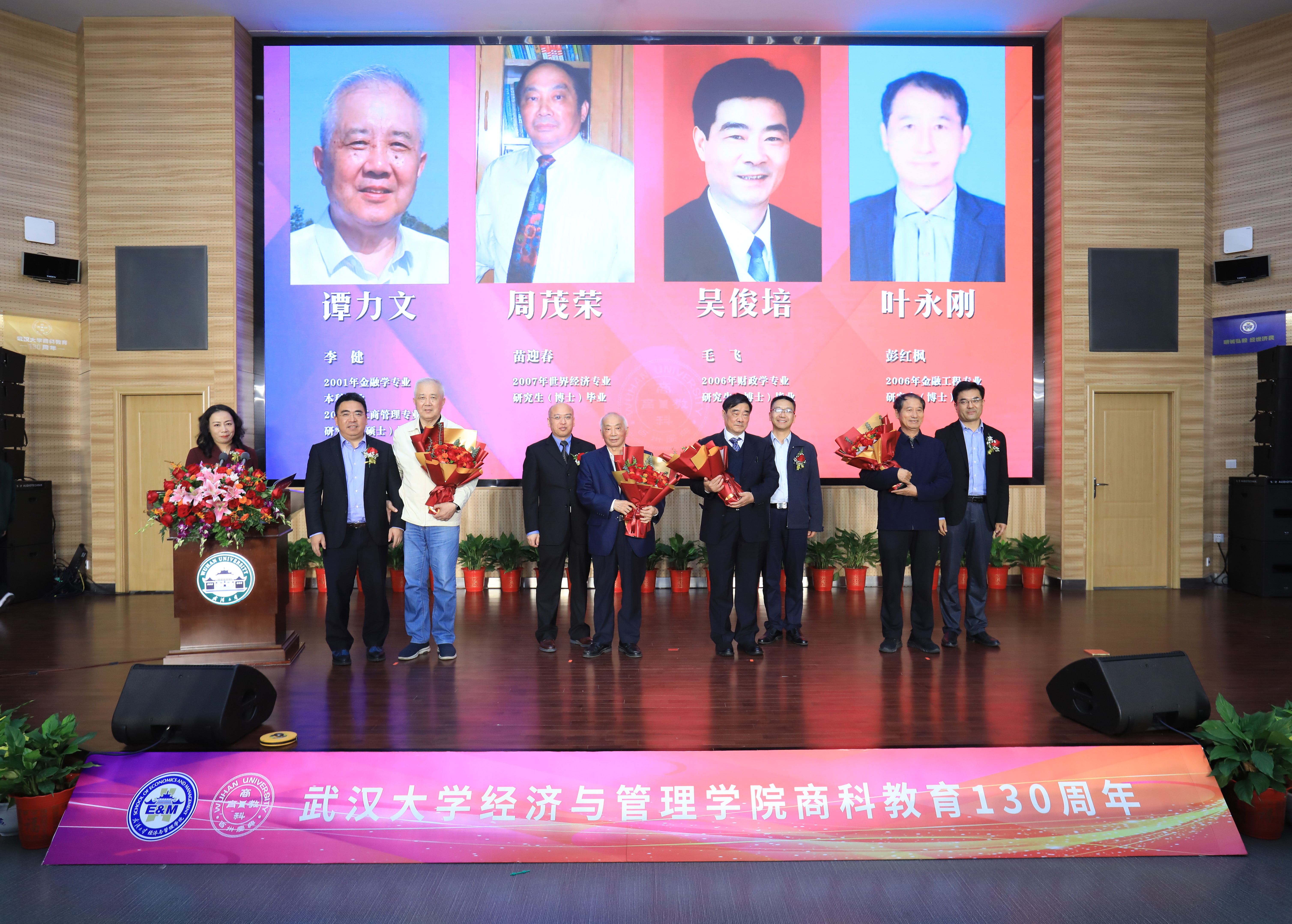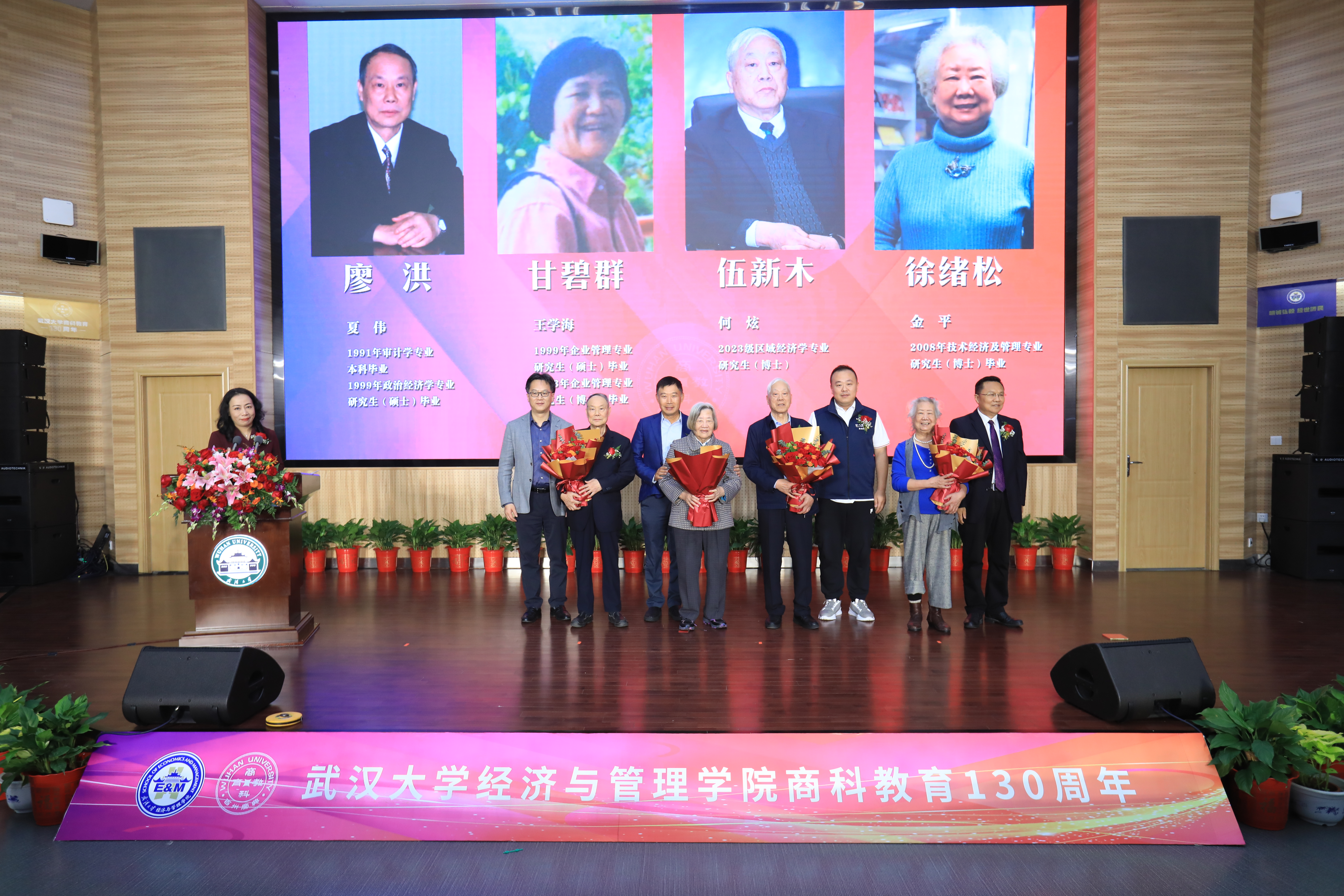 会上,为表达对母校恩师辛勤培育的感激之情,校友代表纷纷向老教师们献花祝福。甘碧群教授、伍新木教授、廖洪教授、徐绪松教授、周茂荣教授、吴俊培教授、谭力文教授、叶永刚教授等缓缓走上讲台,校友们分别向恩师献花致敬。尊师重教、师道传承,浓厚的师生情谊令在场观众动容不已。
