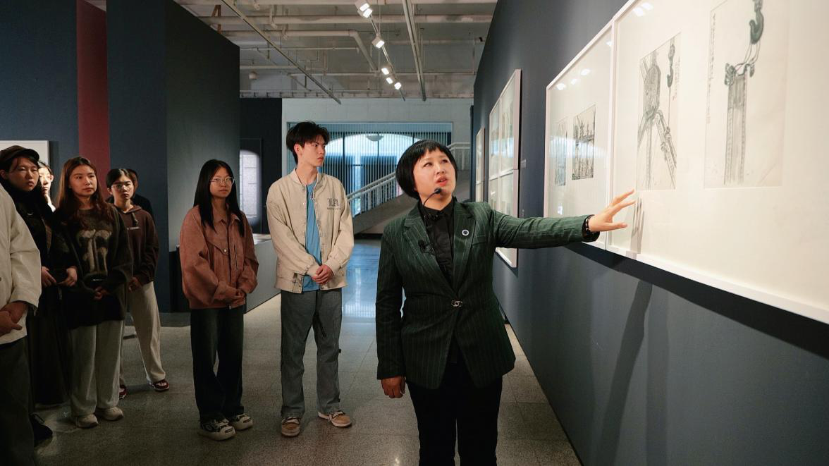 美术馆内,2023年全国美术馆馆藏精品展出季项目“一根钢梁的中国故事——武石经典名作及写生画稿研究展”正在对外展出。鲍清芬以《砥砺思想品德 勇担文艺重任》为题,围绕爱国、为民、崇德、尚艺四个关键词,向现场师生介绍学校老教授武石先生的生平事迹,包括他以木刻刀为“武器”进行抗日救亡宣传,到新中国成立后创作的讴歌新中国建设和社会新风尚的版画作品,再到他艺术生涯的中晚期,以中国画的形式艺术地再现火热的革命斗争情景,引导同学们自觉传承中华优秀传统文化,从学校厚重的历史和精神积淀中汲取力量,努力成长为堪当民族复兴重任的时代新人。现场师生静静聆听,感受老先生在国家命运变迁中的赤子之心和责任担当。