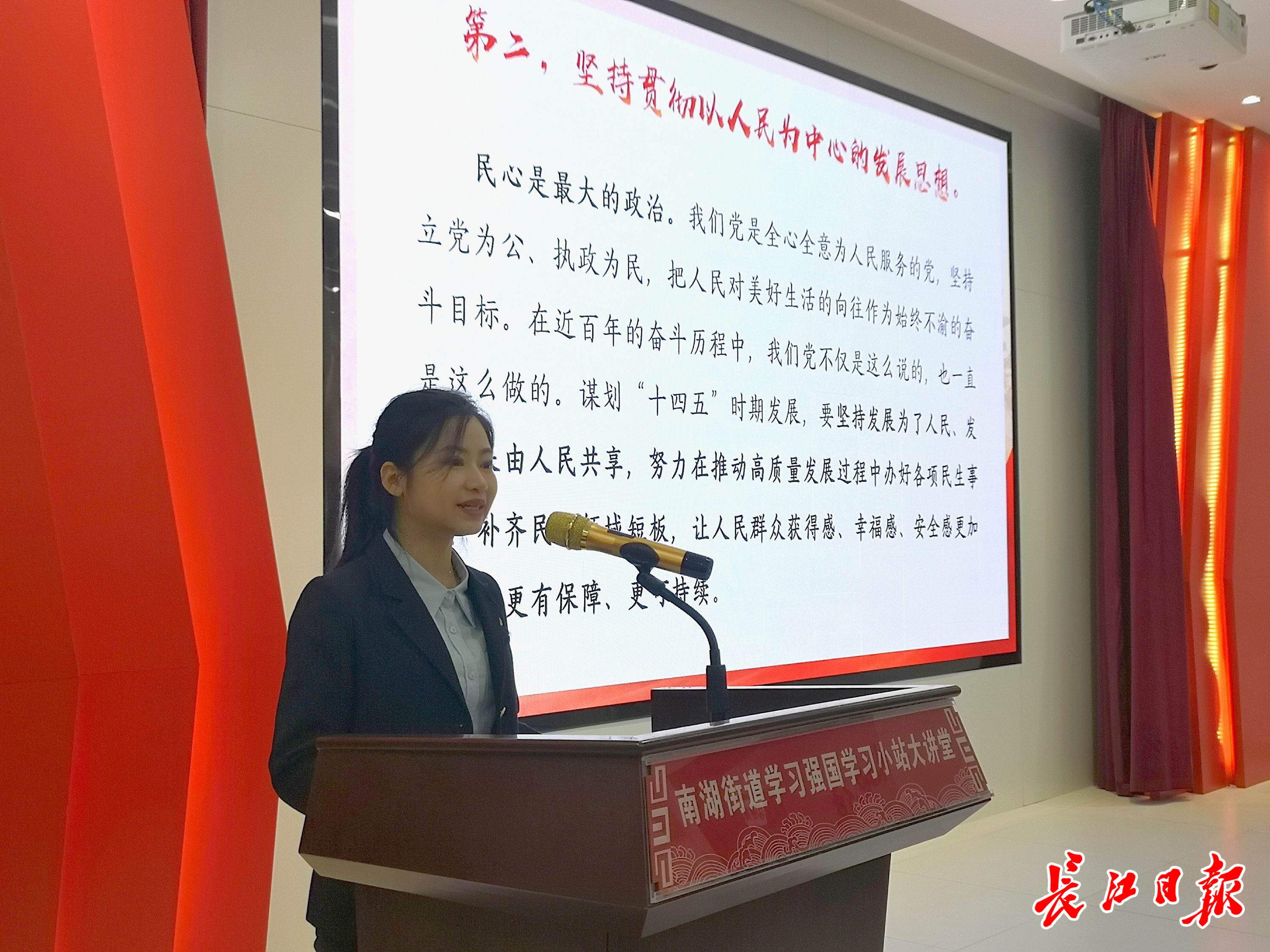 活动现场,首批领学员、中南财经政法大学研究生党员理论宣讲团成员孙逸芳,以“理响南湖学习有我”为题,为居民们作首场宣讲。孙逸芳说:“以前我们主要面对学生,这是我第一次走进社区作宣讲。能把自己所学转化成居民感兴趣的理论知识,为基层党组织建设出力,我感到很荣幸。”
