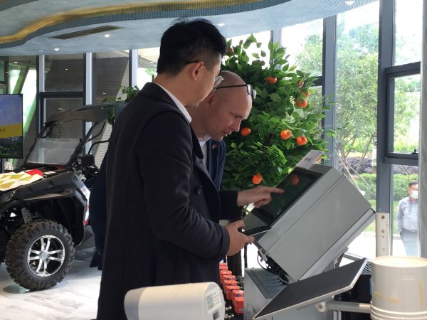 代表团还参观了高农生物园园区企业富邦股份,该公司展示了土壤CT扫描车,采摘机器人、“田小二”APP等数字农业发展成果。该公司副总经理操素芬介绍,去年公司成功控股荷兰Alsys公司,双方还在中国共同成立合资公司,共同开发世界智慧农业终端市场。