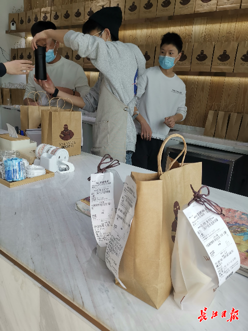 一边和同事核对外卖订单、制作咖啡,马腾飞一边告诉记者,去年7月份,两家从河南来汉的顾客,爸爸妈妈看到网上报道店里送咖啡的事情,专程带着孩子过来打卡,“我们就想看看这么好的咖啡店长什么样?就想尝一口当时医护人员都赞不绝口的‘武汉拿铁’”,而这样事情他们一年碰到好多次。