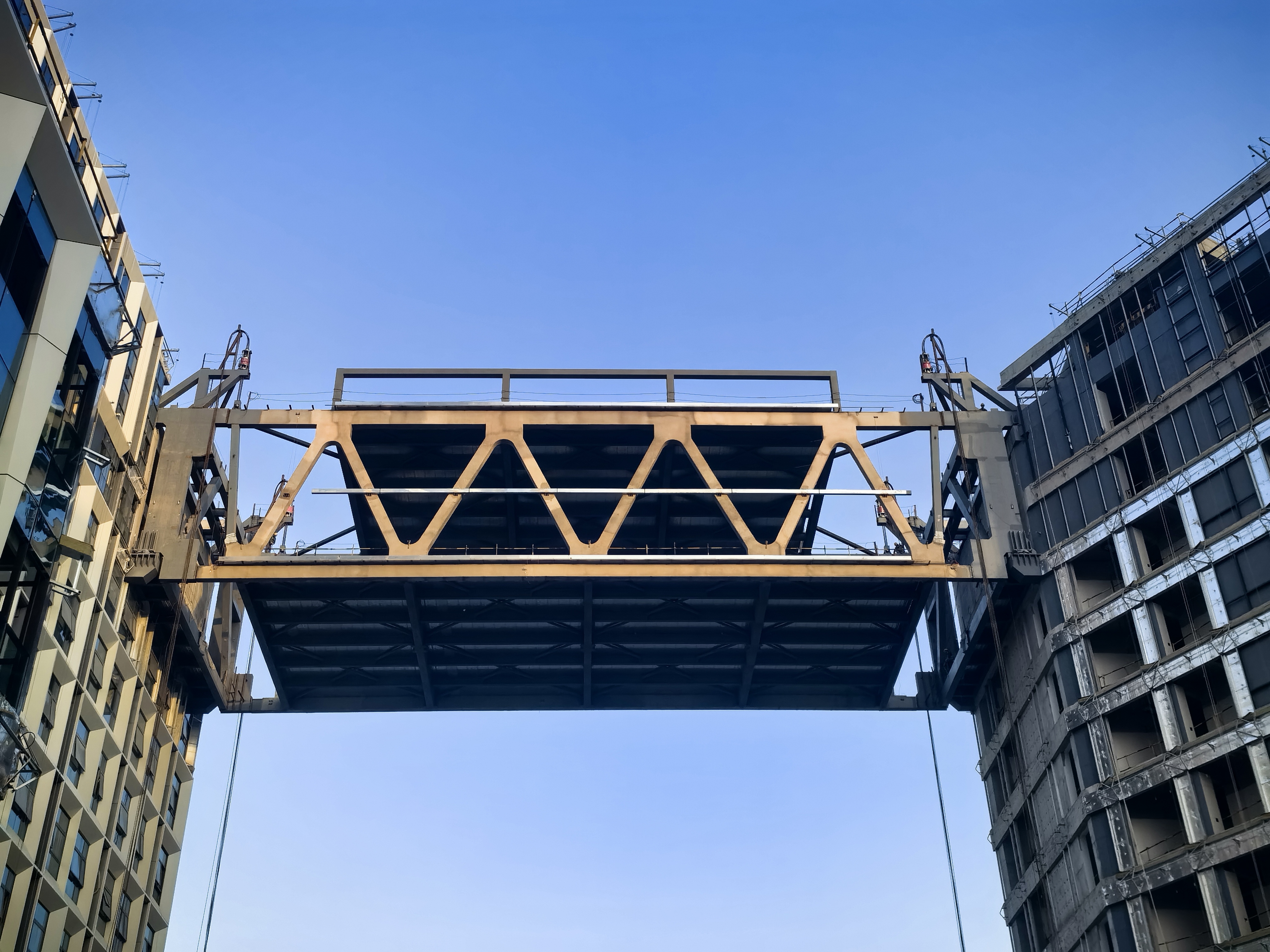 12月6日,重达448吨的钢结构连廊顺利完成整体提升。